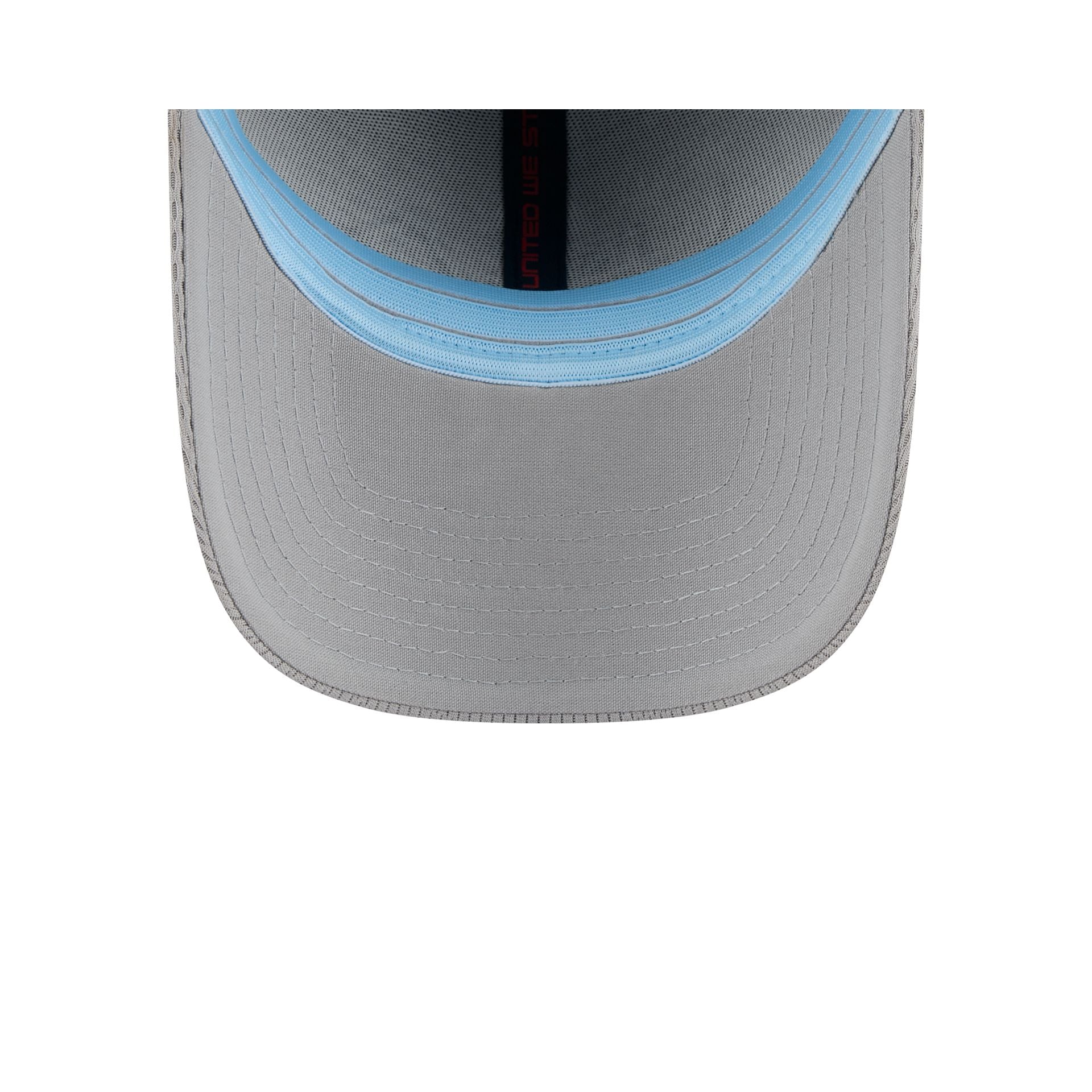 The 2025 Ryder Cup Team USA Gray 39THIRTY Stretch Fit features an embroidered Team USA logo at the front panels with a silicone Ryder Cup logo at the rear. Additional details include a U.S.A. pin at the front left panel and a gray undervisor.
