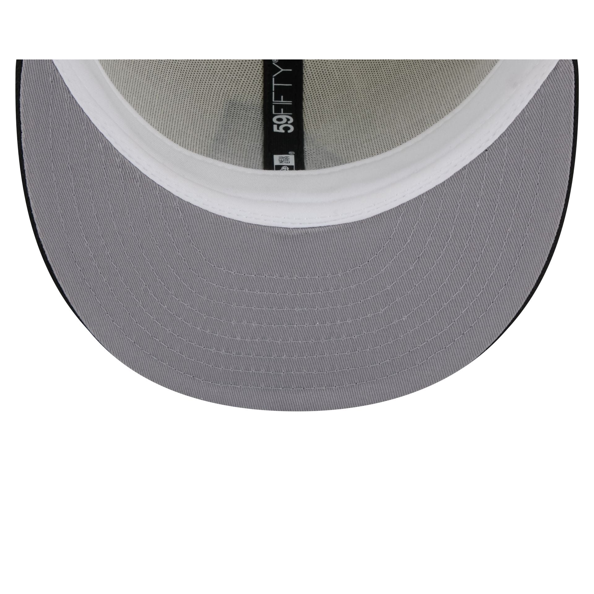 The Arizona Diamondbacks Chrome 59FIFTY Fitted Cap features an embroidered Diamondbacks logo at the front panels with a matching MLB Batterman logo at the rear. a black visor. and a gray undervisor.