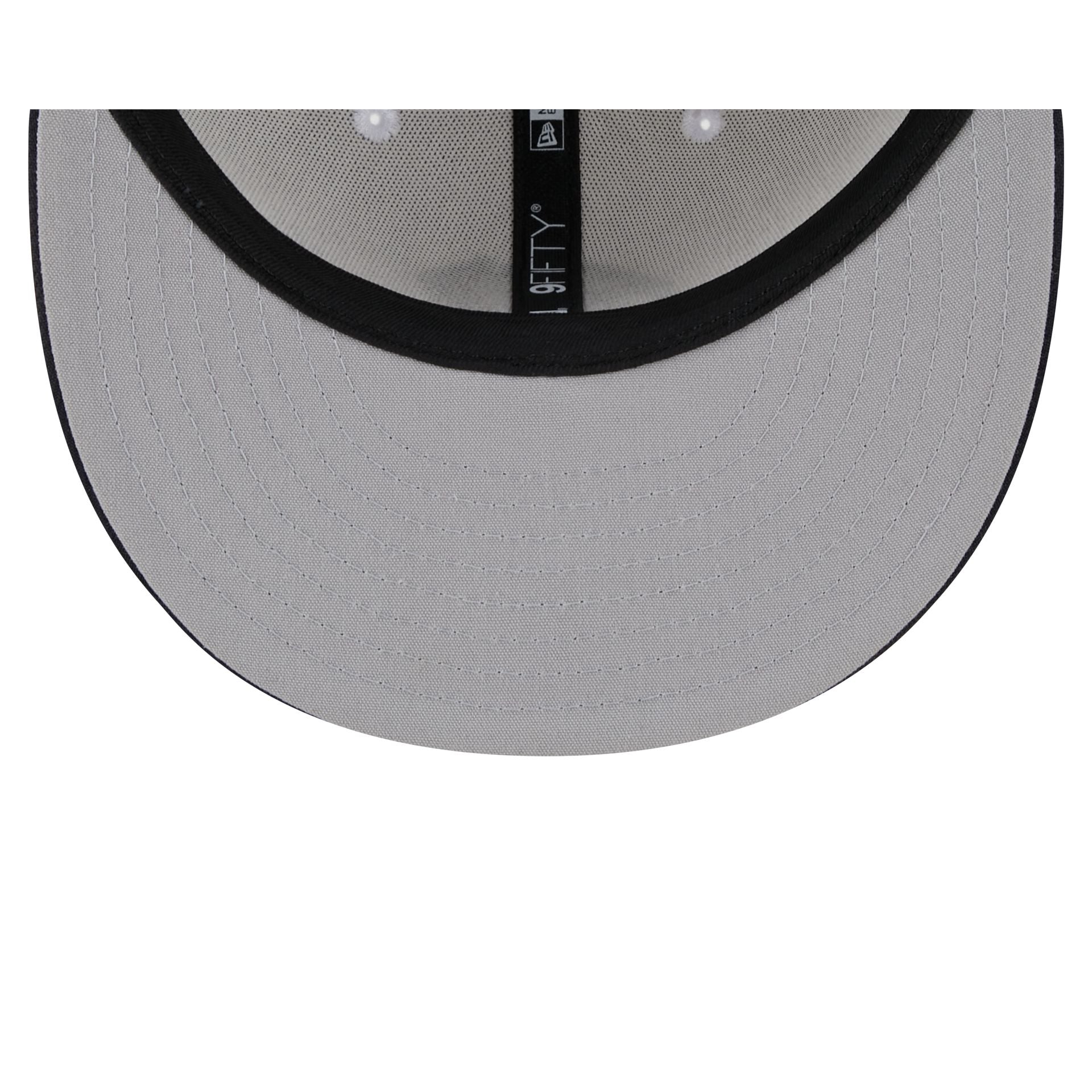 The Atlanta Braves 2025 Batting Practice 9FIFTY Snapback features an embroidered Braves logo at the front panels with a matching snapback closure at the rear. Additional details include a pivot knit fabrication. a navy visor. and a gray undervisor.