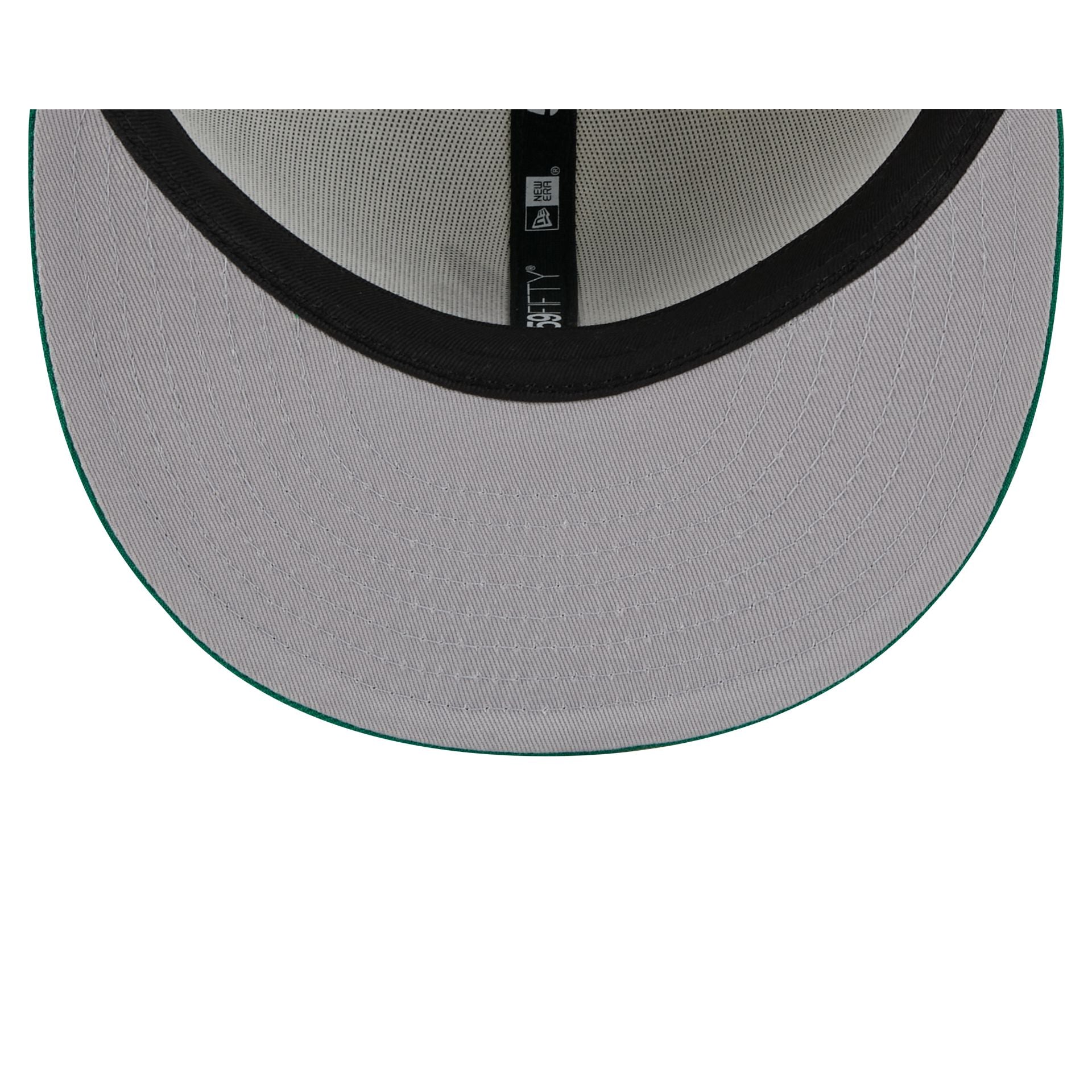 The Atlanta Braves Beaded Linen 59FIFTY Fitted Cap features a red. white and green beaded Braves logo at the front panels with a matching MLB Batterman logo at the rear. Additional details include an embroidered team wordmark at the right-wear side with a green visor and a gray undervisor.