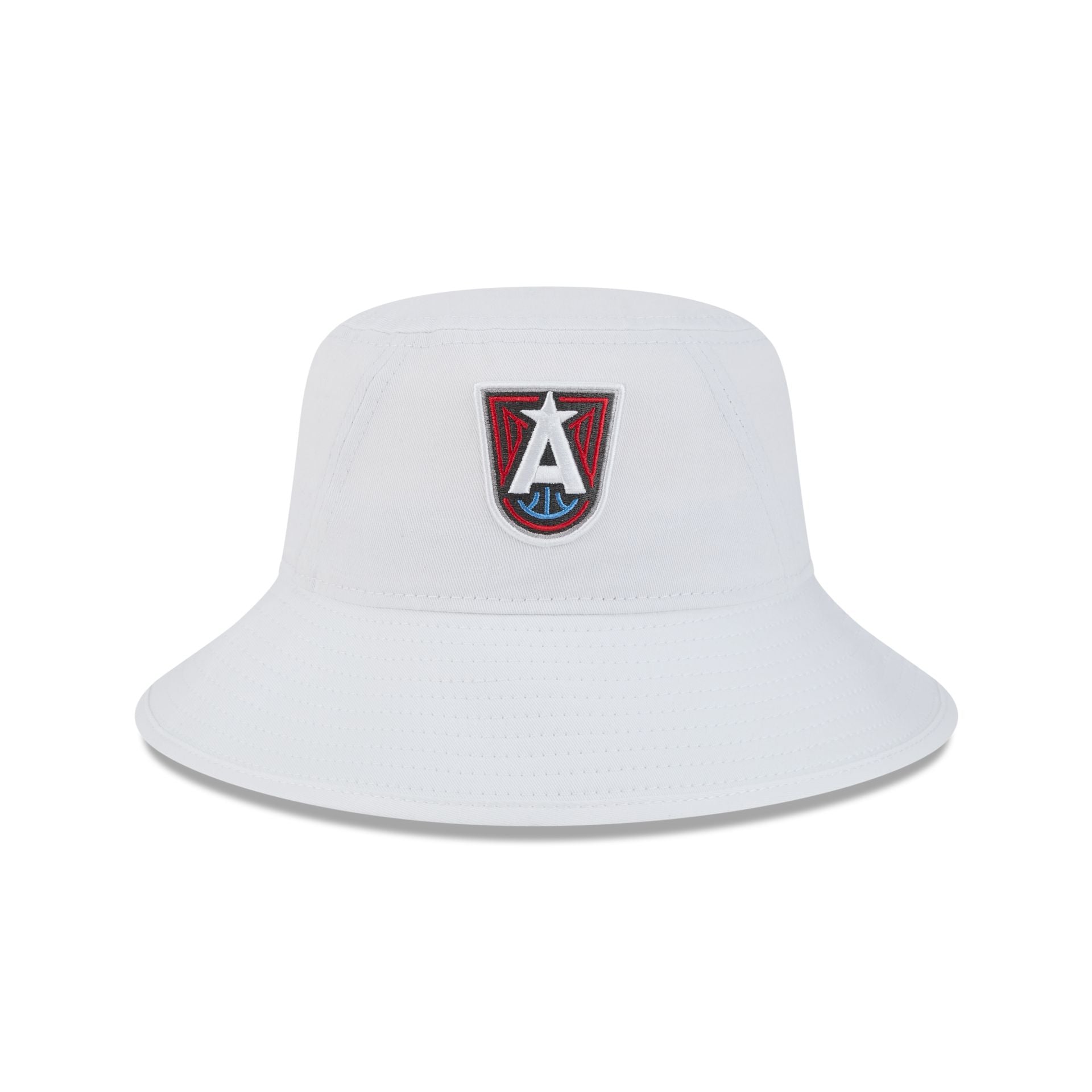 The Atlanta Dream Optic White Bucket Hat features an embroidered Dream logo at the front with a matching New Era Flag at the left-wear side.