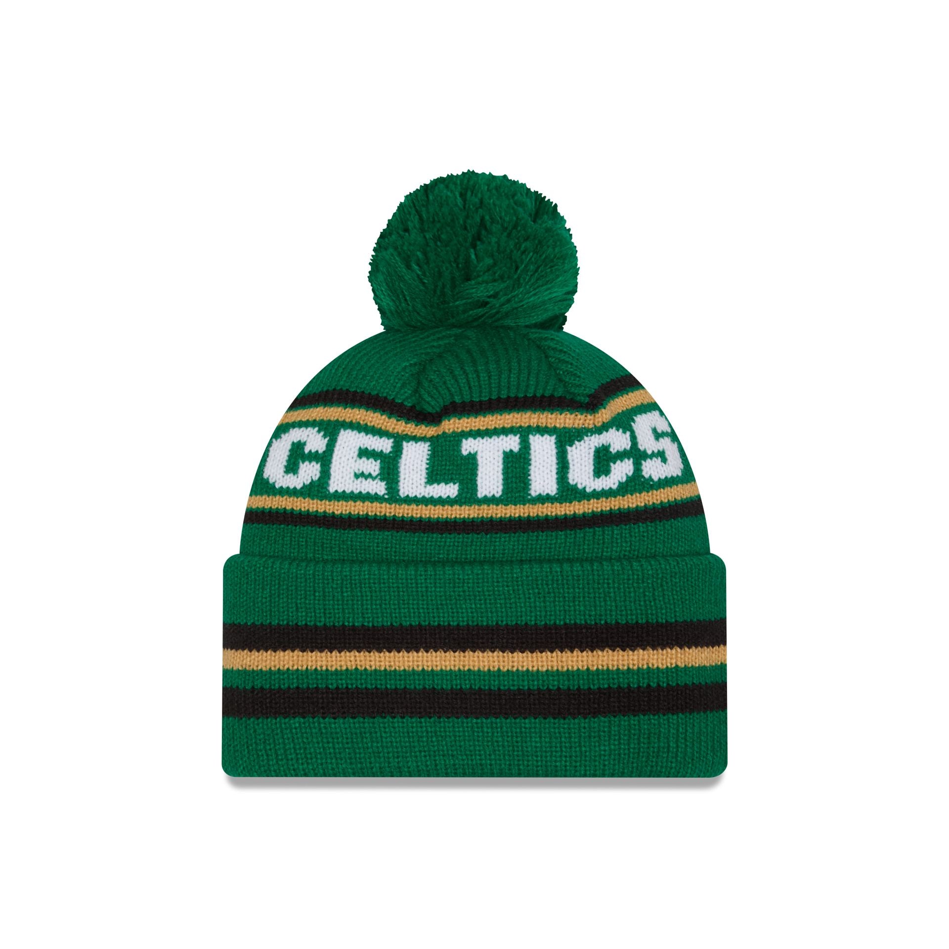 The Boston Celtics Classic Pom Knit Hat features an embroidered Celtics logo at the front cuff with a wordmark at the crown and a one-time removable pom.