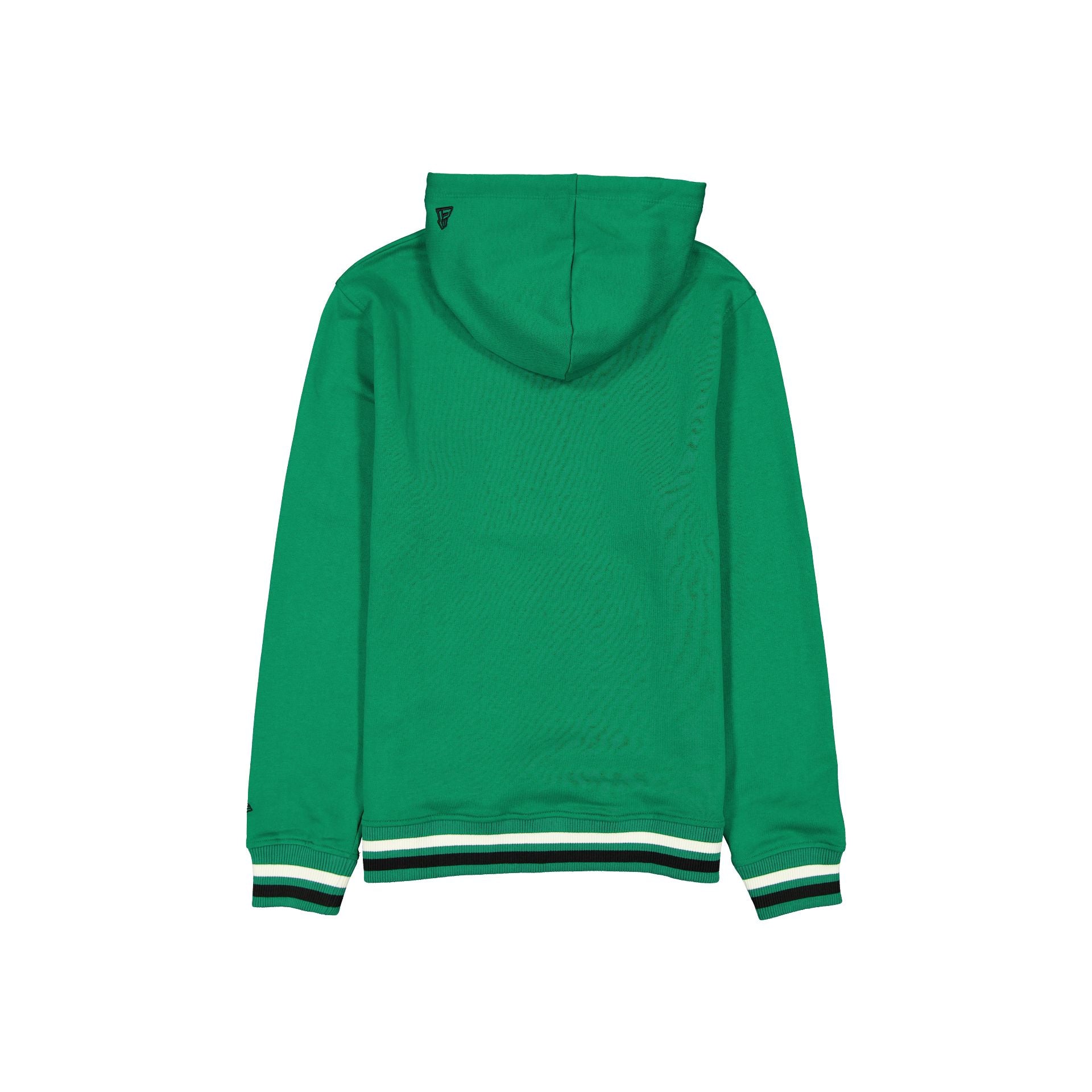 The Boston Celtics Throwback Hoodie features a felt applique Celtics wordmark at the front with kangaroo pockets. adjustable drawstrings at the hood. and a New Era jock tag at the left pocket.