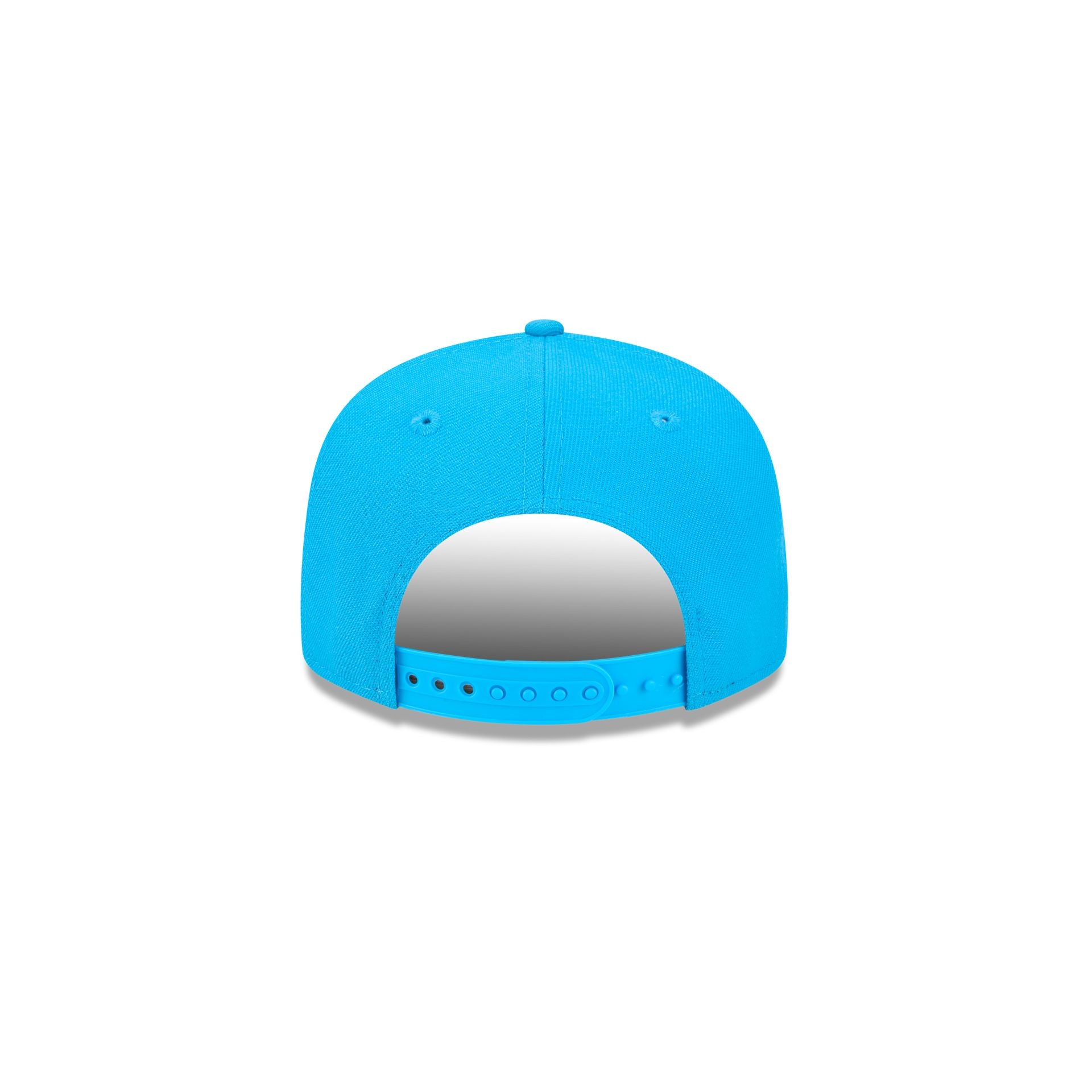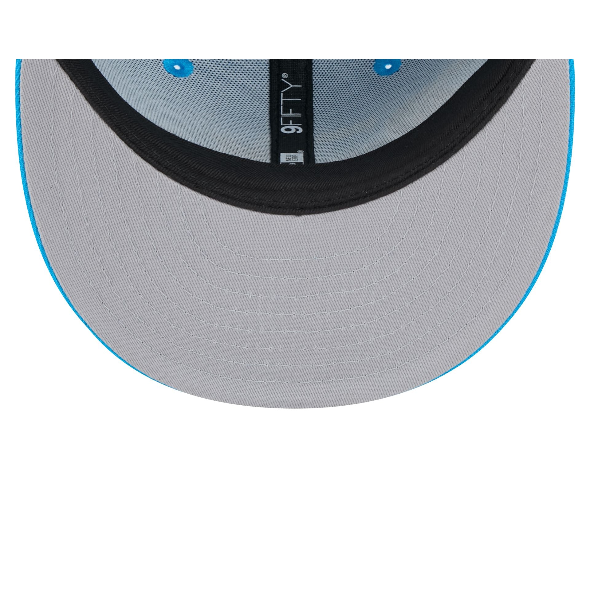 The Carolina Panthers Kids 9FIFTY Snapback Hat features an embroidered Panthers wordmark at the front panels with a matching team logo at the right-wear side. Additional details include a gray undervisor and a snapback closure at the rear.