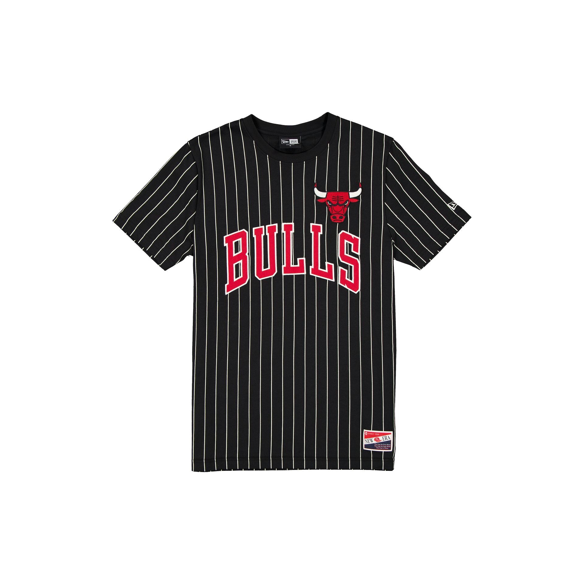 The Chicago Bulls Throwback Pinstripe Wordmark T-Shirt features a twill applique Bulls wordmark and logo at the front with a New Era jock tag at the left hip.