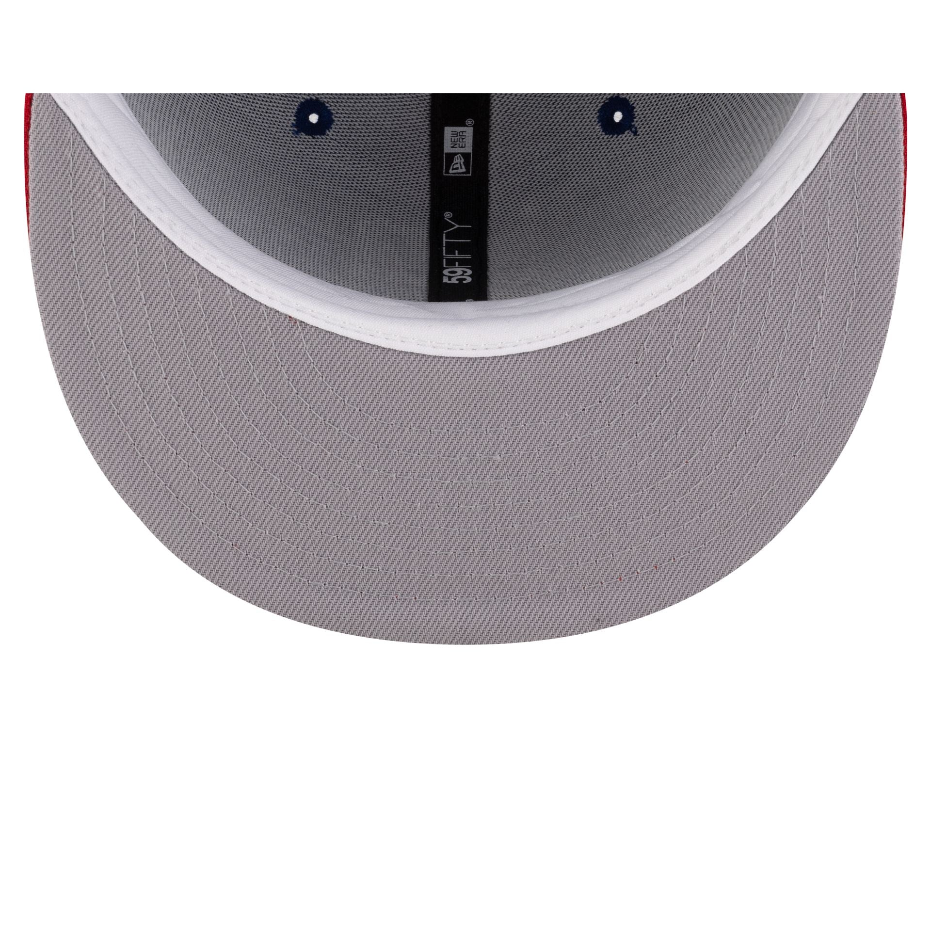 The Chicago Cubs Mascot Blue 59FIFTY Fitted Cap features an embroidered Cubs mascot at the front panels with a matching MLB Batterman logo at the rear. Additional details include a Wrigley Field patch at the right-wear side and a gray undervisor.