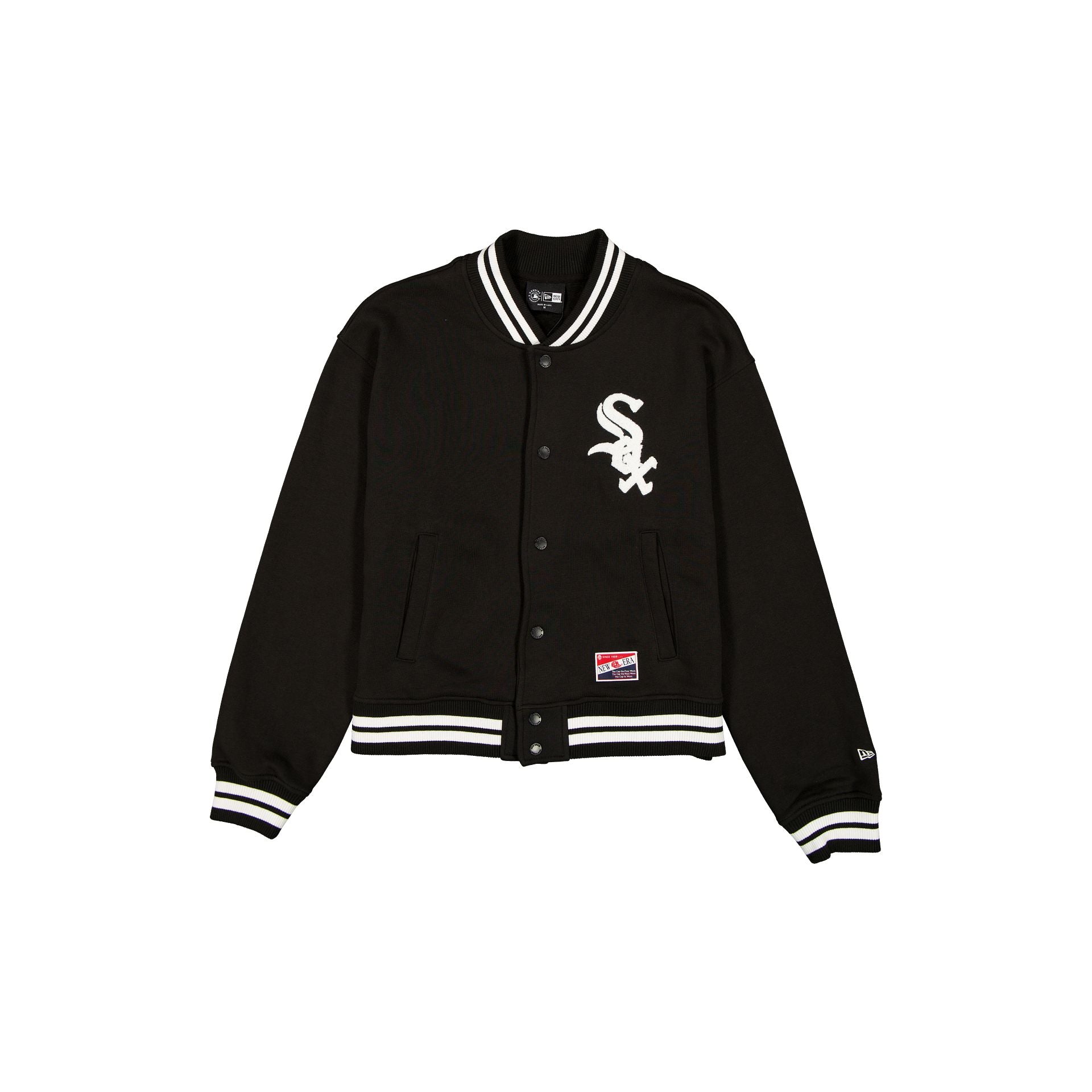 The Chicago White Sox Throwback Women’s Snap Front Jacket features a chenille White Sox logo at the left chest a snap button closure and front pockets.