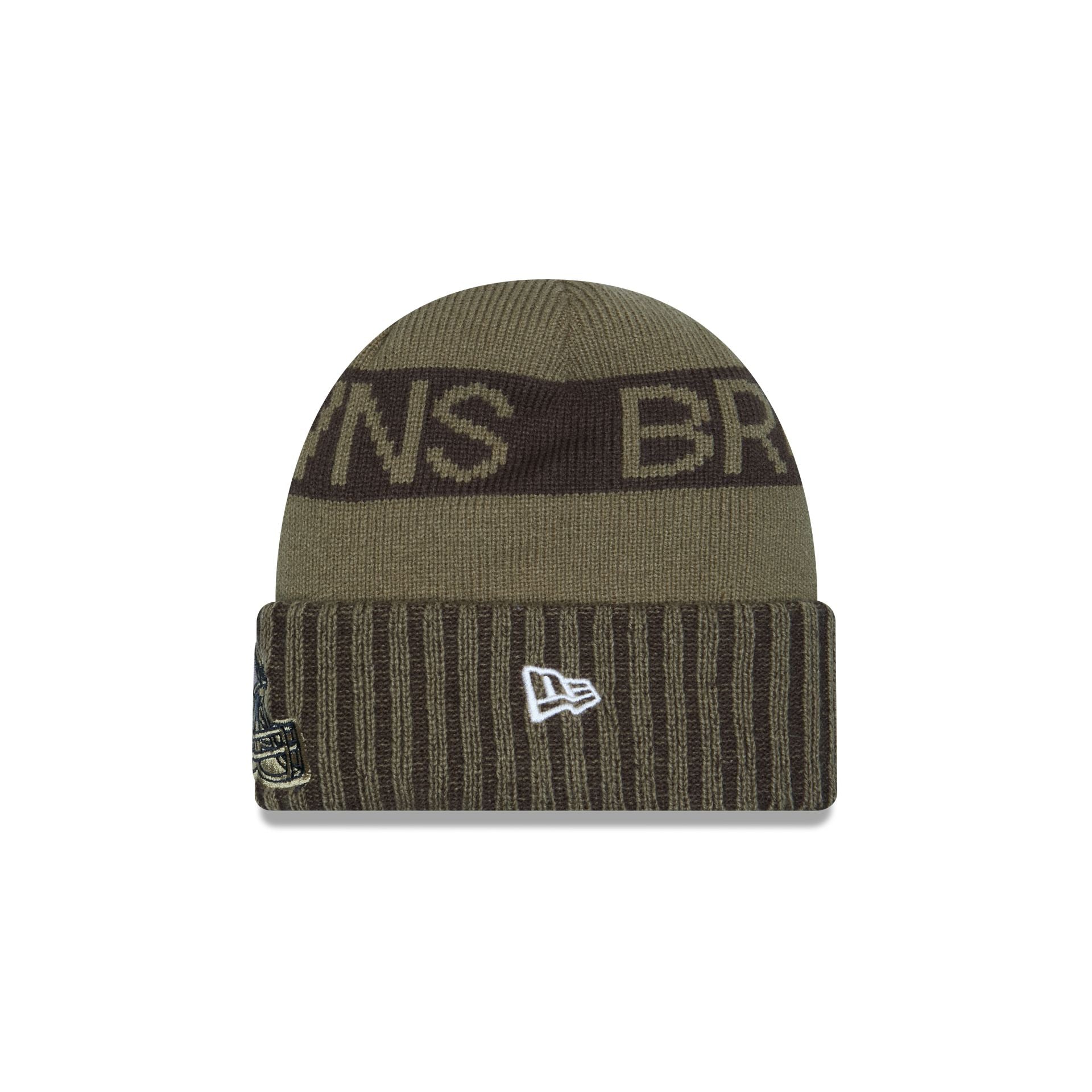 The Cleveland Browns 2025 Salute to Service Cuff Knit features an embroidered Browns logo at the front with a team wordmark at the crown. an American flag patch at the right-wear side. and the official NFL Salute to Service patch at the rear.
