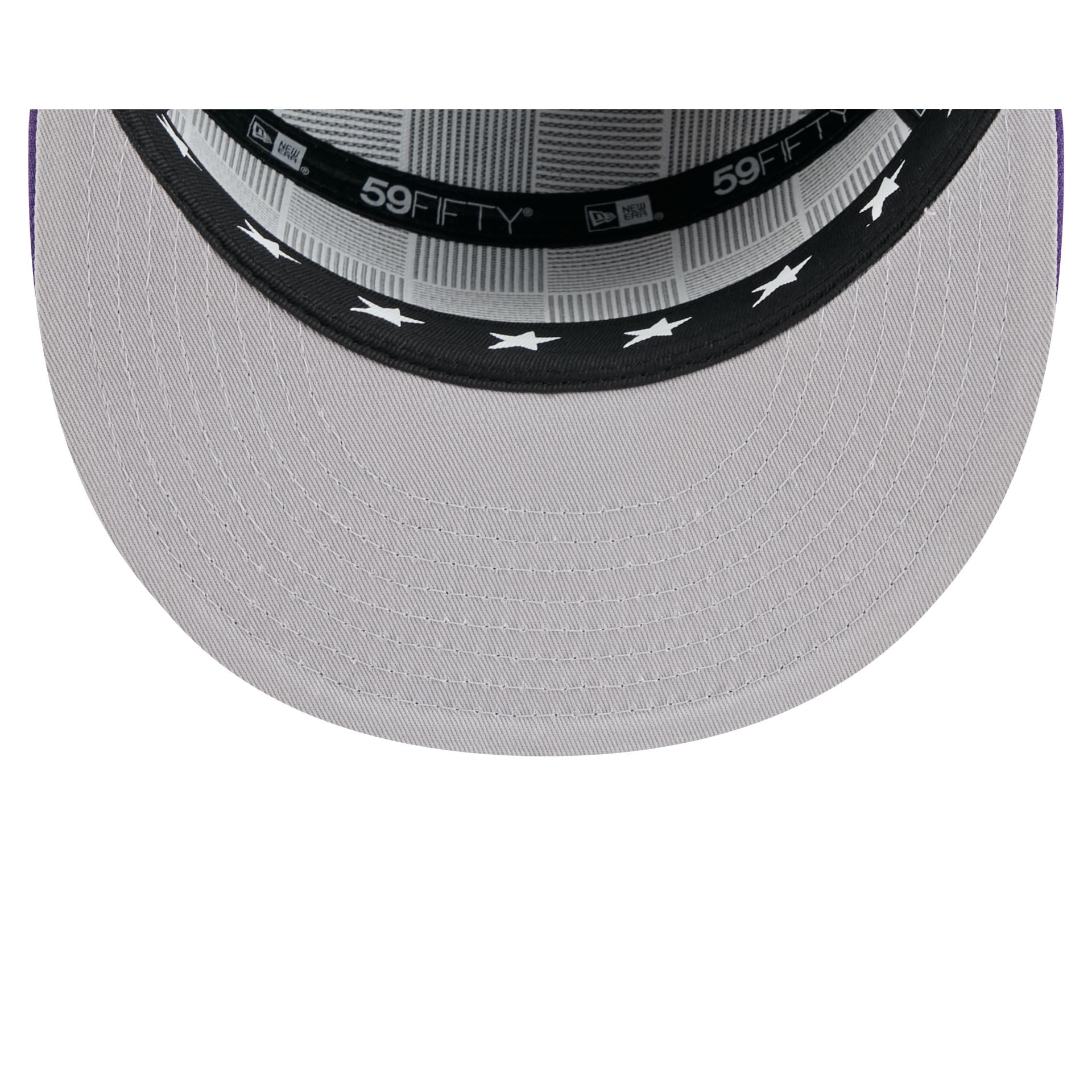 The Colorado Rockies 2025 All-Star Game Split Panel 59FIFTY Fitted Cap features an embroidered Rockies logo at the front panels against a split-crown construction with breathable mesh fabric at the side and rear panels. Additional details include stars at the top panel. a 2025 All-Star Game patch at the right-wear side. the MLB Batterman logo at the rear. and a gray undervisor. The cap also features screen-printed stars on the sweatband.
