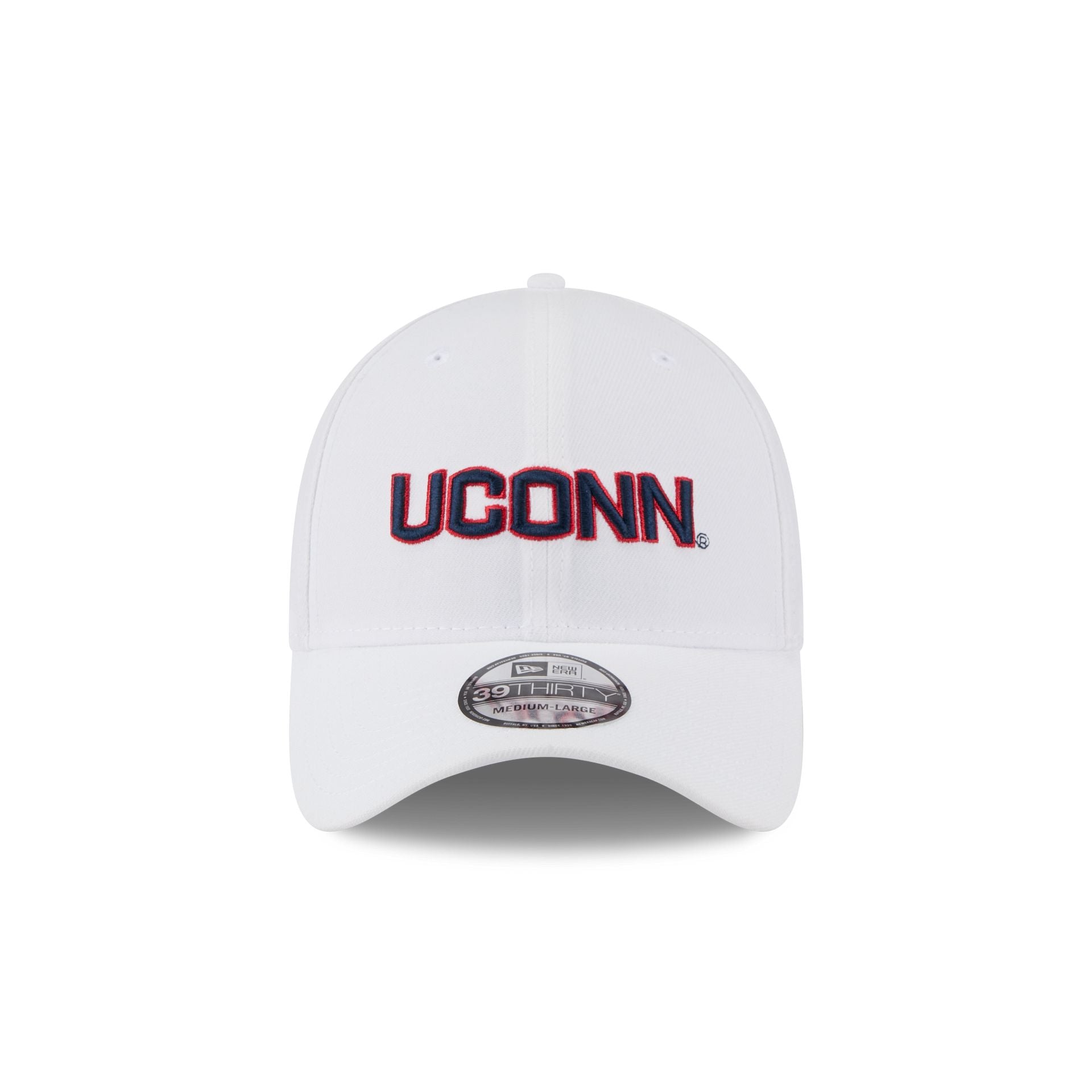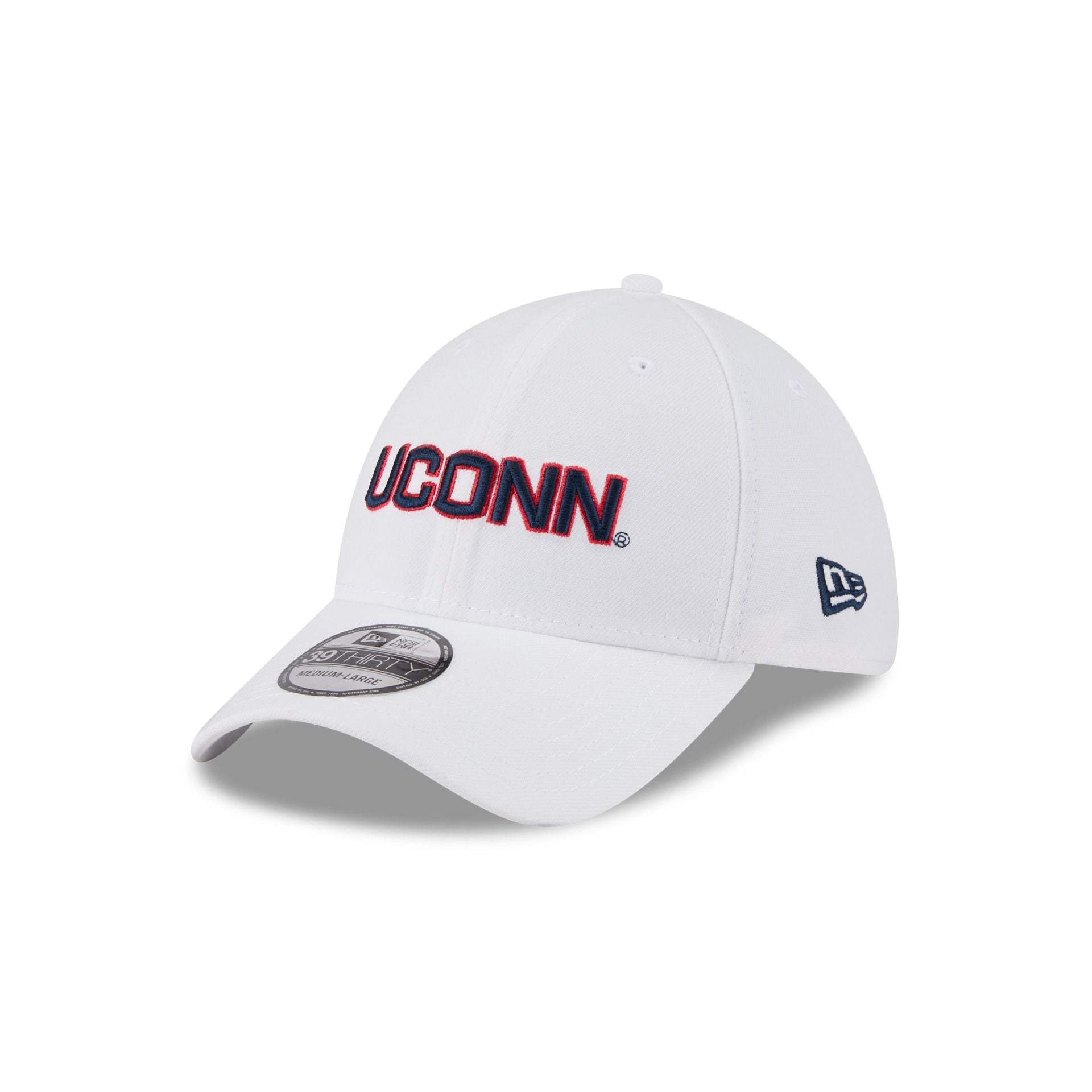 The Connecticut Huskies Optic White 39THIRTY Stretch Fit features an embroidered Huskies logo at the front panels with a team wordmark at the rear.