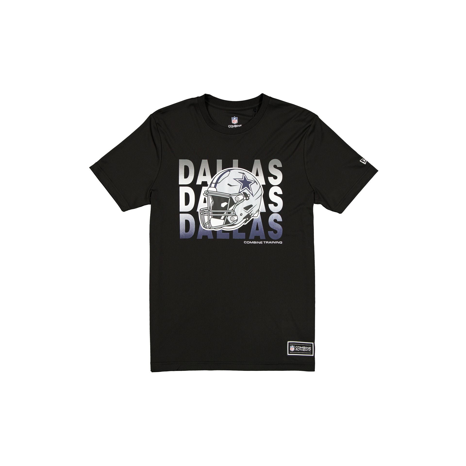 The Dallas Cowboys 2025 Training Black T-Shirt features a screen-printed Cowboys helmet graphic at the chest with a heat sealed NFL Combine Authentic jock tag at the hem.