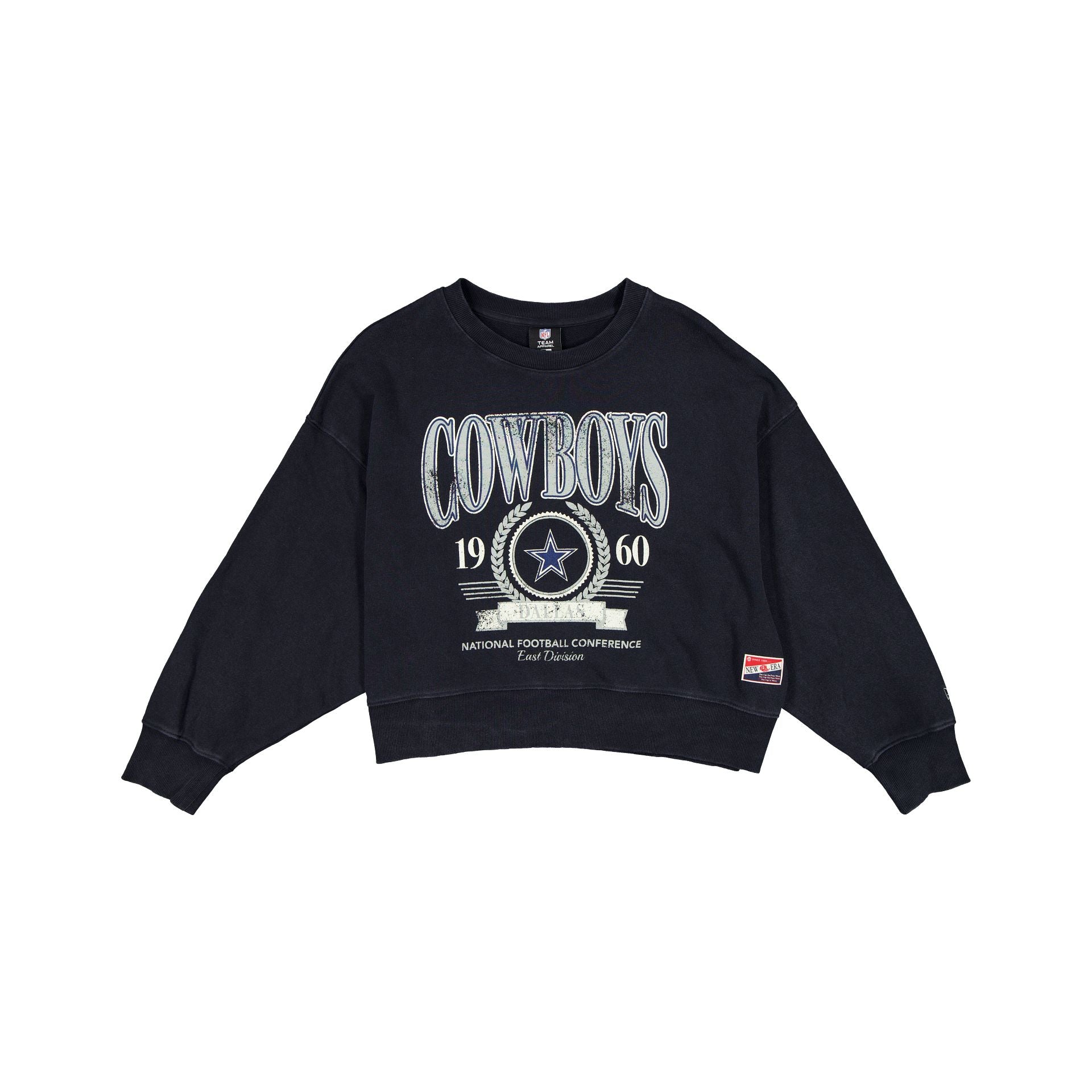 The Dallas Cowboys Throwback Women’s Crewneck features a screen-printed Cowboys graphic at the front and a New Era jock tag at the left hip.