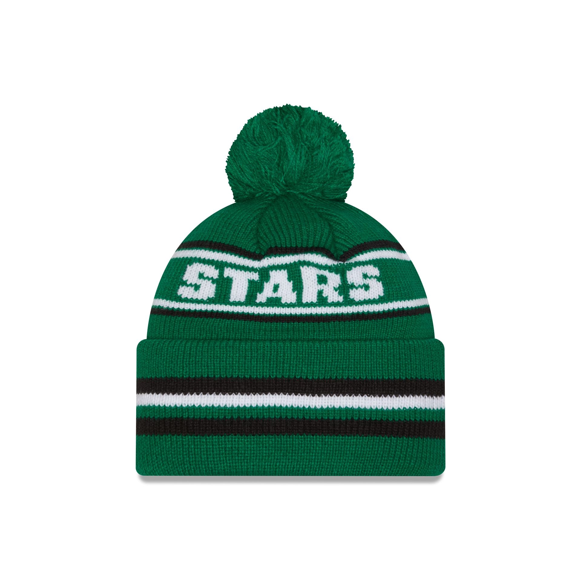 The Dallas Stars Classic Pom Knit Hat features an embroidered Stars logo at the front cuff with a wordmark at the crown and a one-time removable pom.