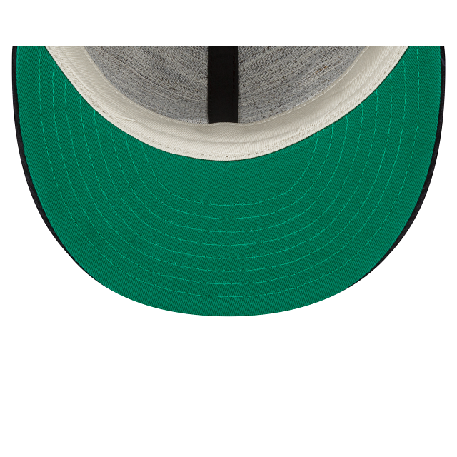 The Fear of God Essentials Corduroy Navy 59FIFTY Fitted Cap features an unstructured crown with an embroidered Fear of God logo at the front panels. a matching MLB Batterman logo at the rear. and a green undervisor.