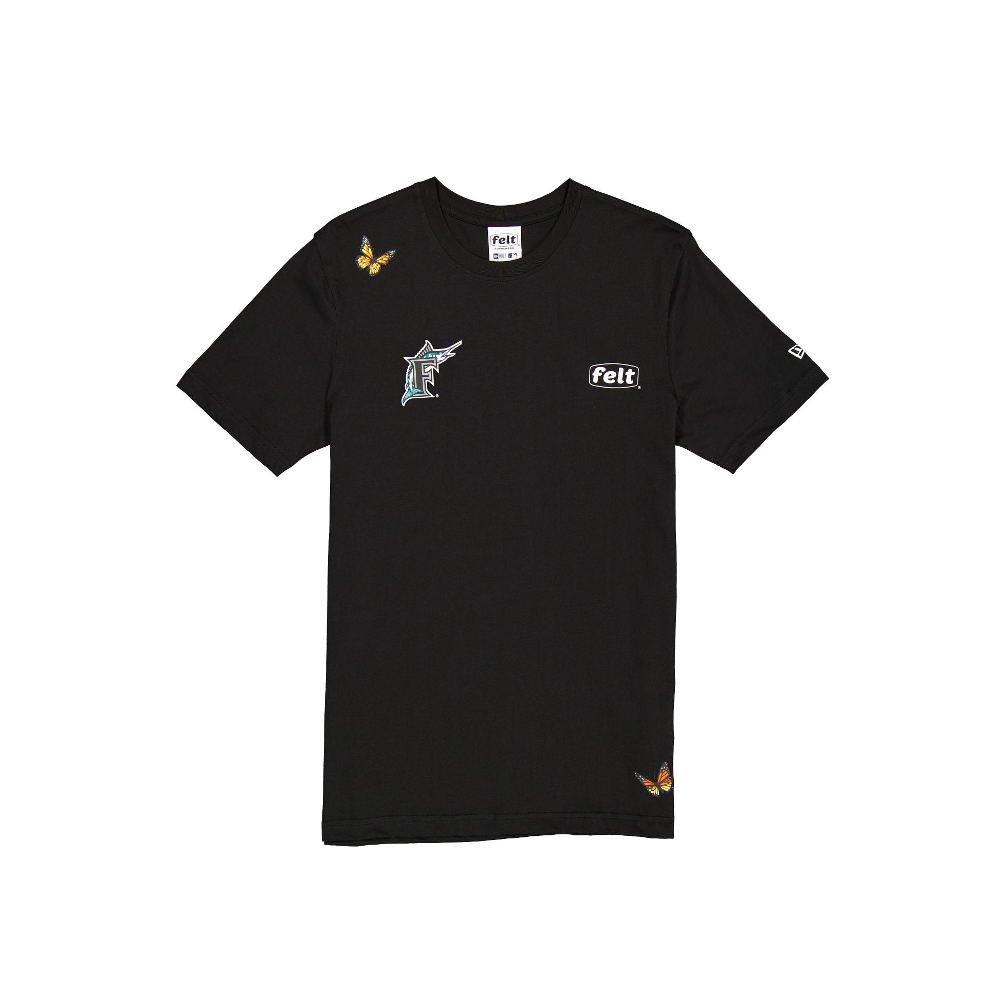 The FELT x Miami Marlins Black T-Shirt features a screen-printed Marlins Cooperstown logo at the right chest and a FELT logo at the left chest with butterflies throughout.