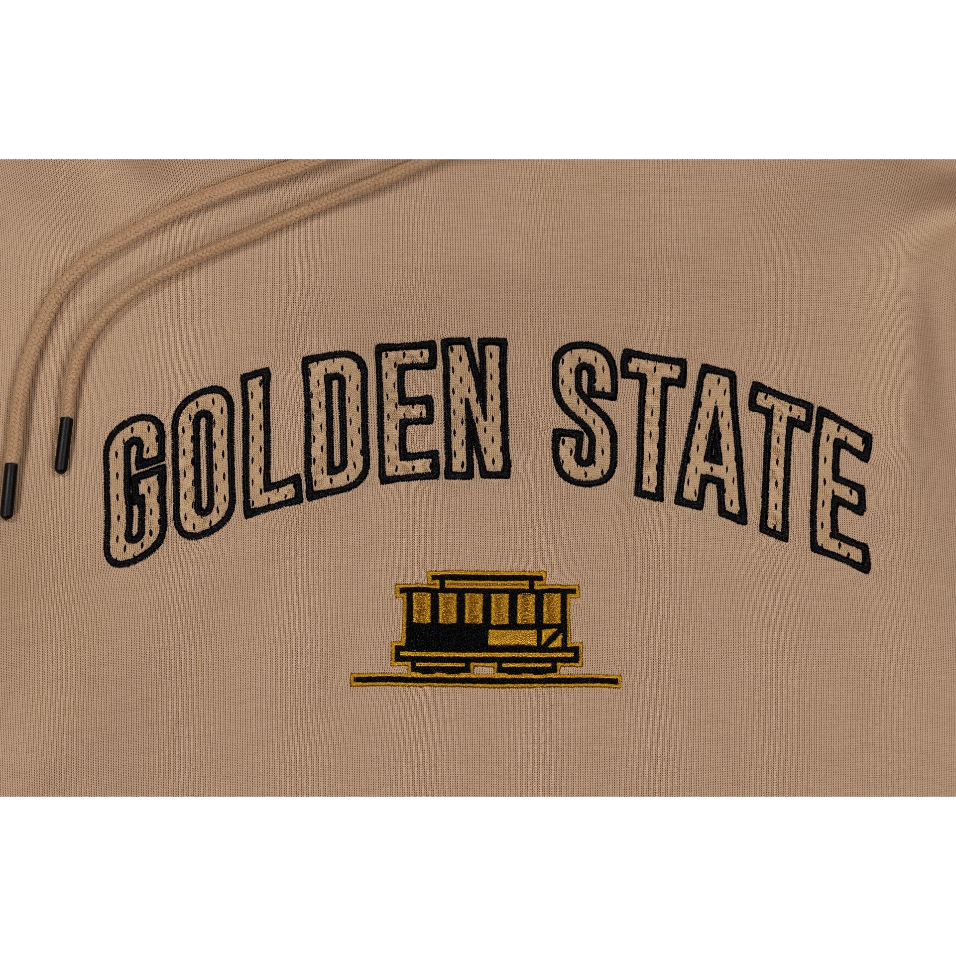 The Golden State Warriors 2023 City Edition Tan Hoodie features a mesh applique Warriors wordmark and embroidered team logo at the chest with a team jock tag at the kangaroo pocket.