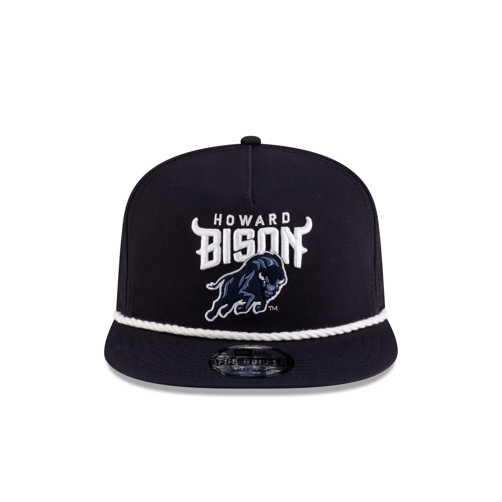 The Howard Bison Navy Golfer features an embroidered Bison logo at the front panels with a matching logo at the right-wear side. a snapback closure at the rear. and a gray undervisor.