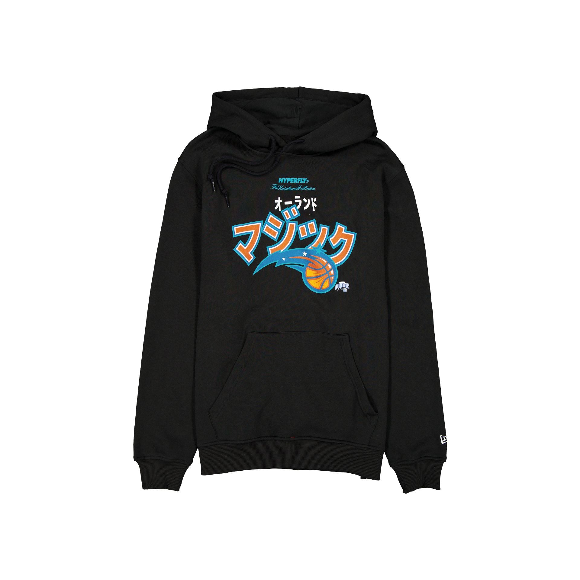The Orlando Magic 2025 All-Star Game Hoodie features a screen-printed Katakana-themed Magic graphic at the front.
