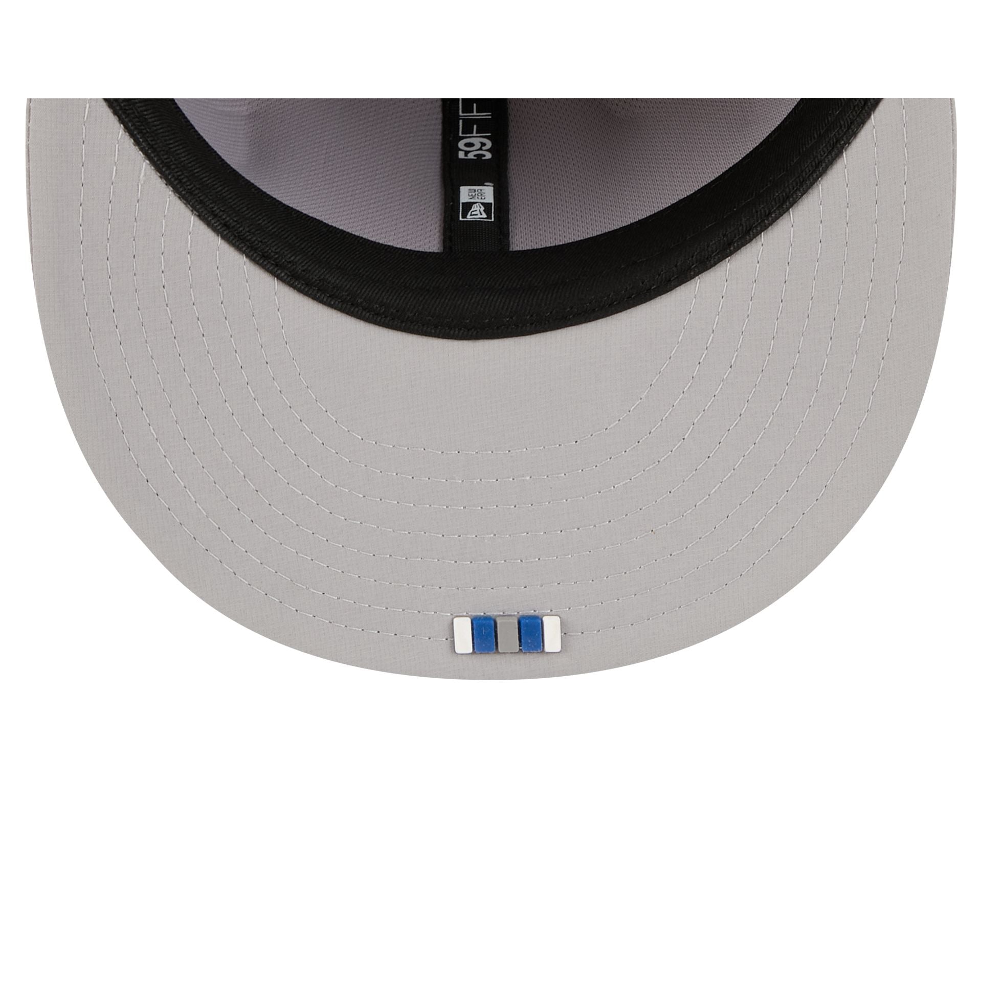 The Indianapolis Colts 2025 Sideline Hot Weather Gray 59FIFTY Fitted Cap features a sewn-down silicone Colts logo patch at the front panels with a matching Official NFL Shield logo at the rear. The cap has a water-repellent quill tech fabrication throughout. with a quick-dry cushioned sweatband to absorb moisture. The undervisor is accented with a silicone transfer in the team’s colors.