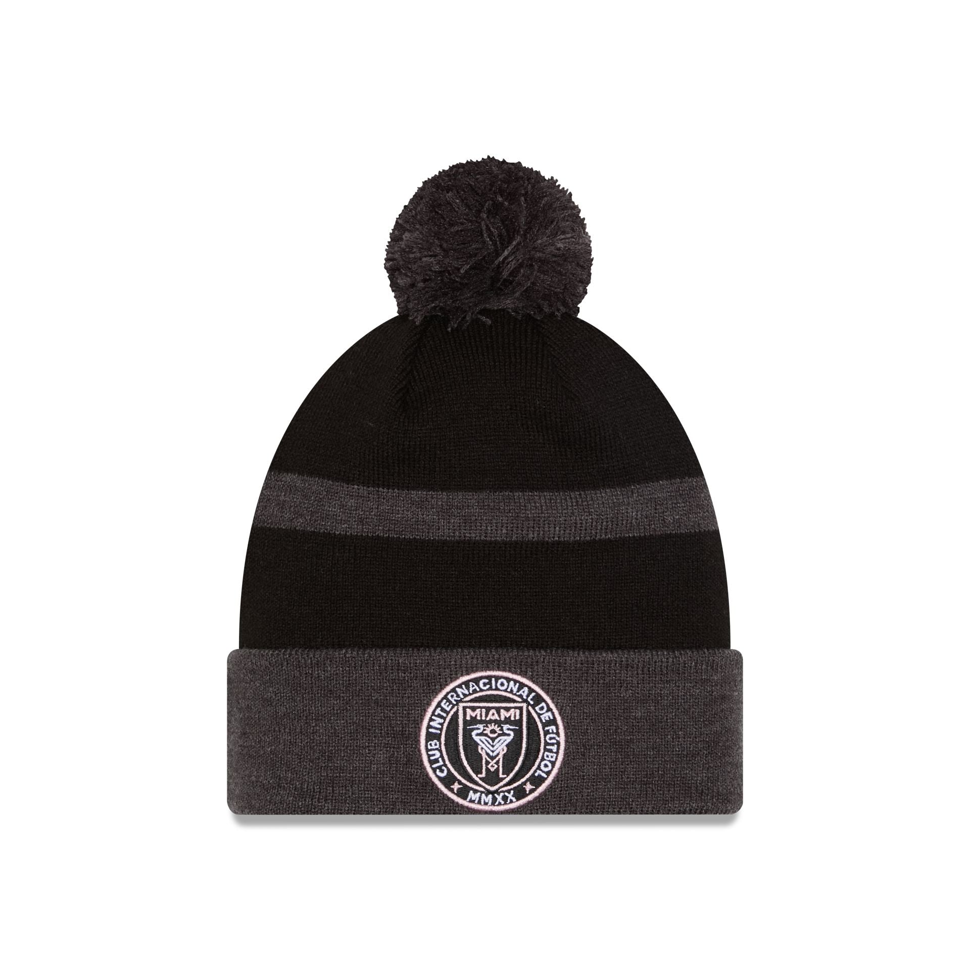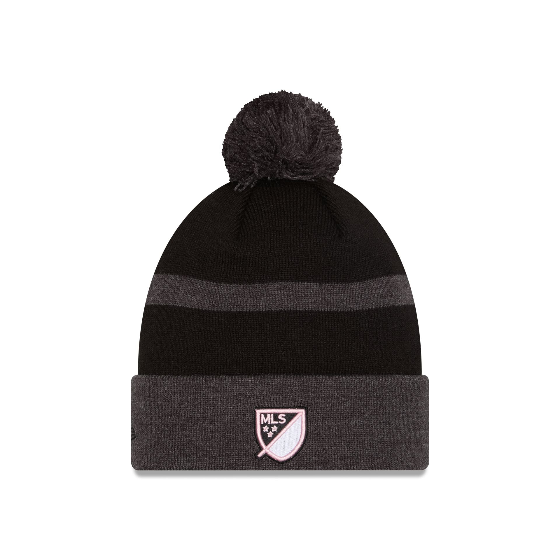 The Inter Miami 2025 MLS Kickoff Pom Knit features an embroidered Inter Miami logo at the front cuff with a matching MLS Shield at the rear and a one-time removable pom.