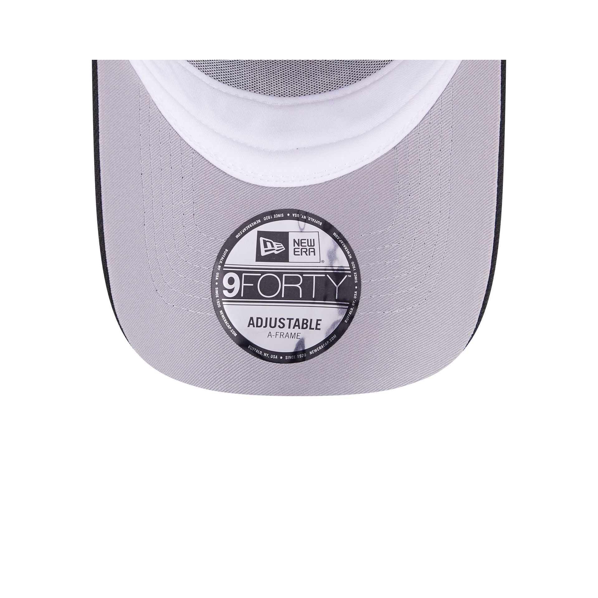 The Los Angeles Dodgers Ornate Visor 9FORTY A-Frame Snapback features an embroidered Dodgers logo at the front panel with a gold ornate embroidered trim at the visor. a gray undervisor. and a snapback closure at the rear.