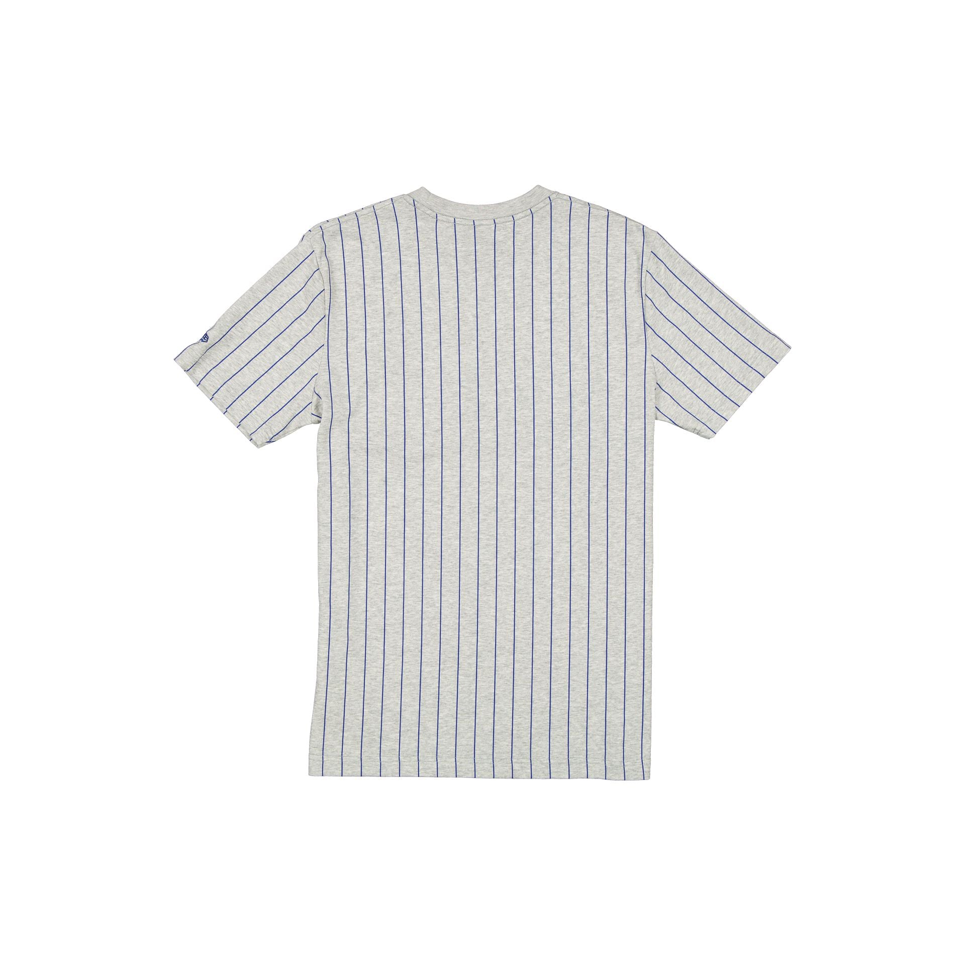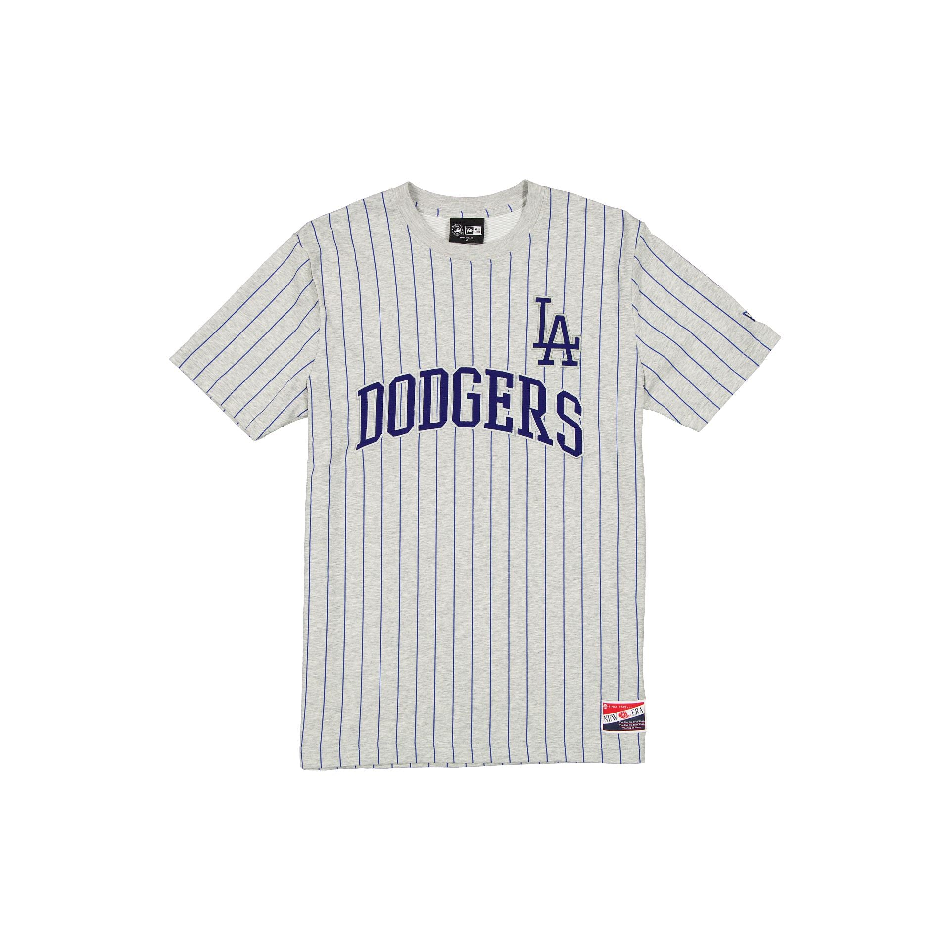 The Los Angeles Dodgers Throwback Retro Gray Pinstripe T-Shirt features an embroidered Dodgers wordmark at the front with a twill applique logo at the left chest.