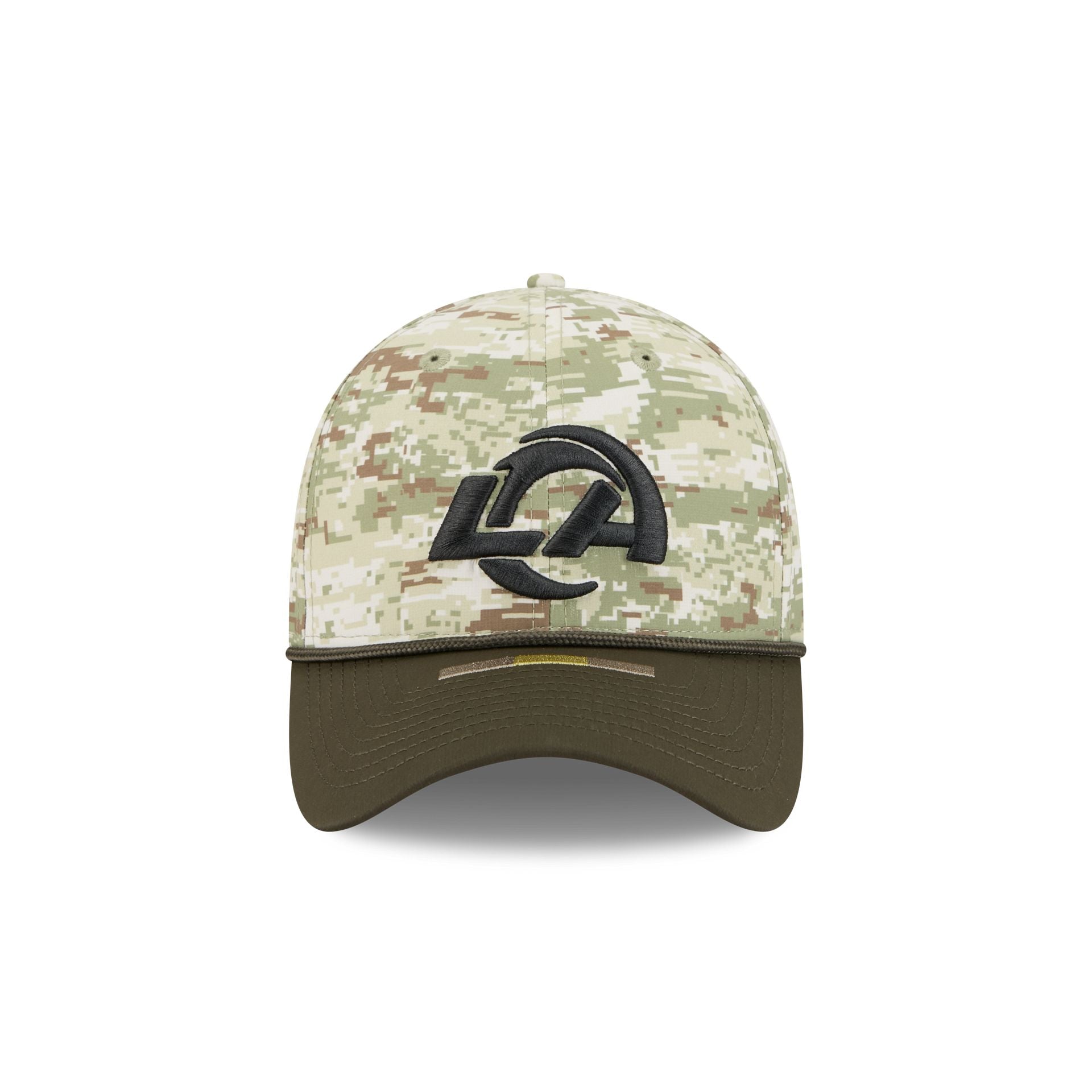 The Los Angeles Rams 2025 Salute to Service Digi Camo 39THIRTY Stretch Fit Cap features an embroidered Rams logo at the front panels with the official NFL Salute to Service patch at the rear and American flag patch at the right-wear side. Additional details include three green stripes at the visor and a silicone team logo patch at a dark green undervisor..