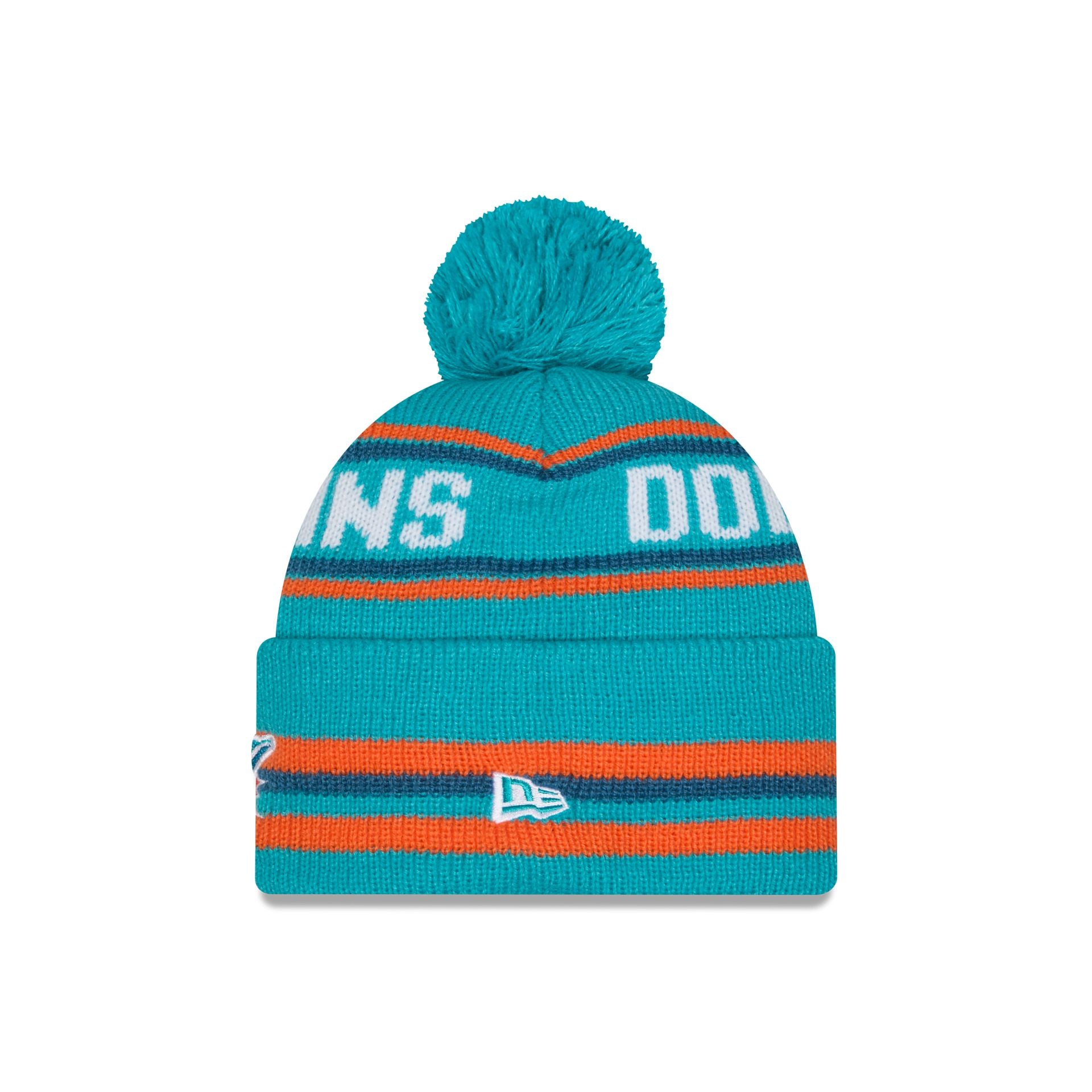 The Miami Dolphins Classic Pom Knit Hat features an embroidered Dolphins logo at the front cuff with a wordmark at the crown and a one-time removable pom.