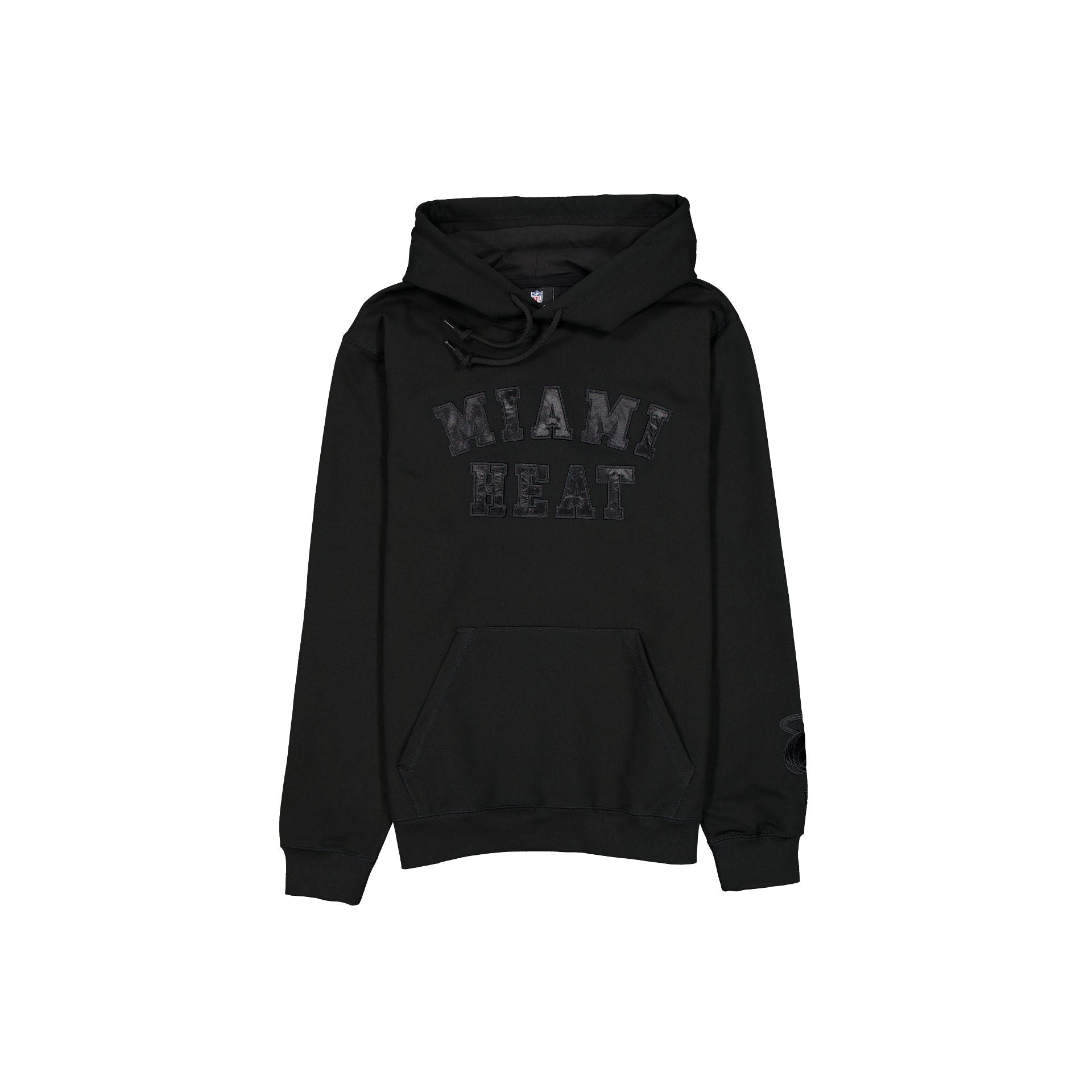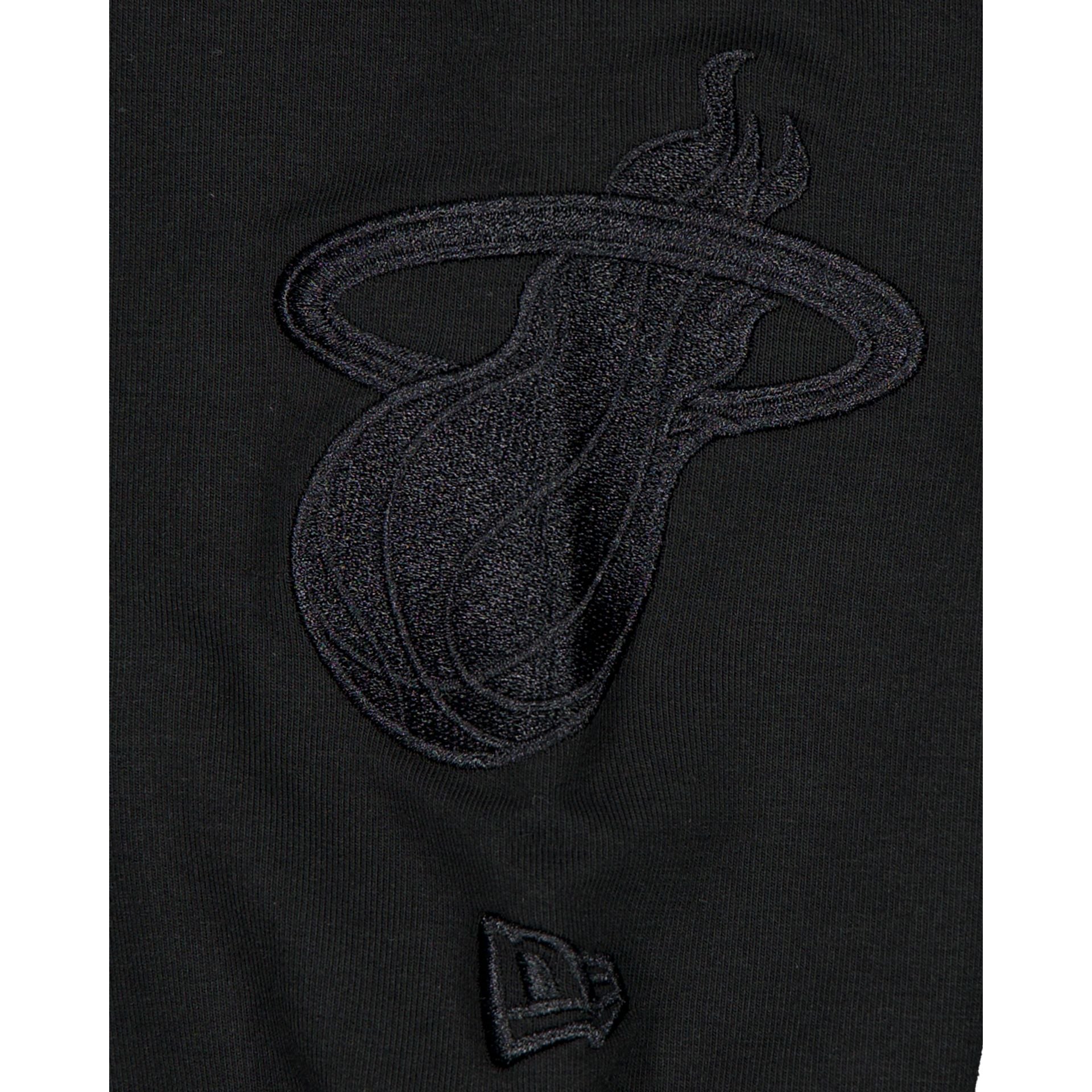 The Miami Heat Black on Black Logo Select Hoodie features a satin applique with a tonal stitch Heat wordmark at the chest and an embroidered team logo at the left-wear sleeve.
