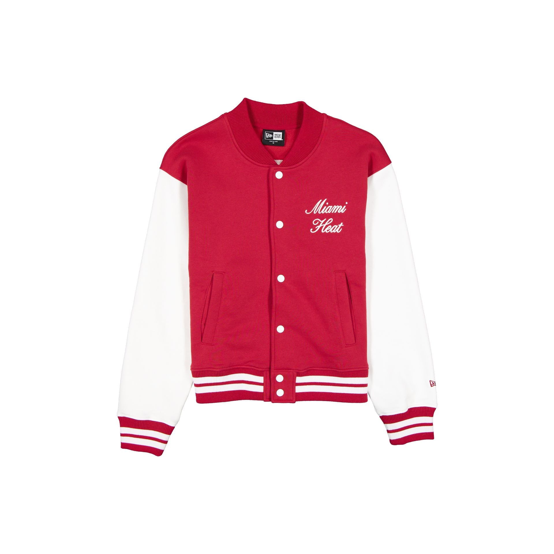 The Miami Heat Throwback Prep Women’s Jacket features a chain-stitched Heat script at the left chest with a snap front closure and a chenille applique wordmark with team emblem at the rear.