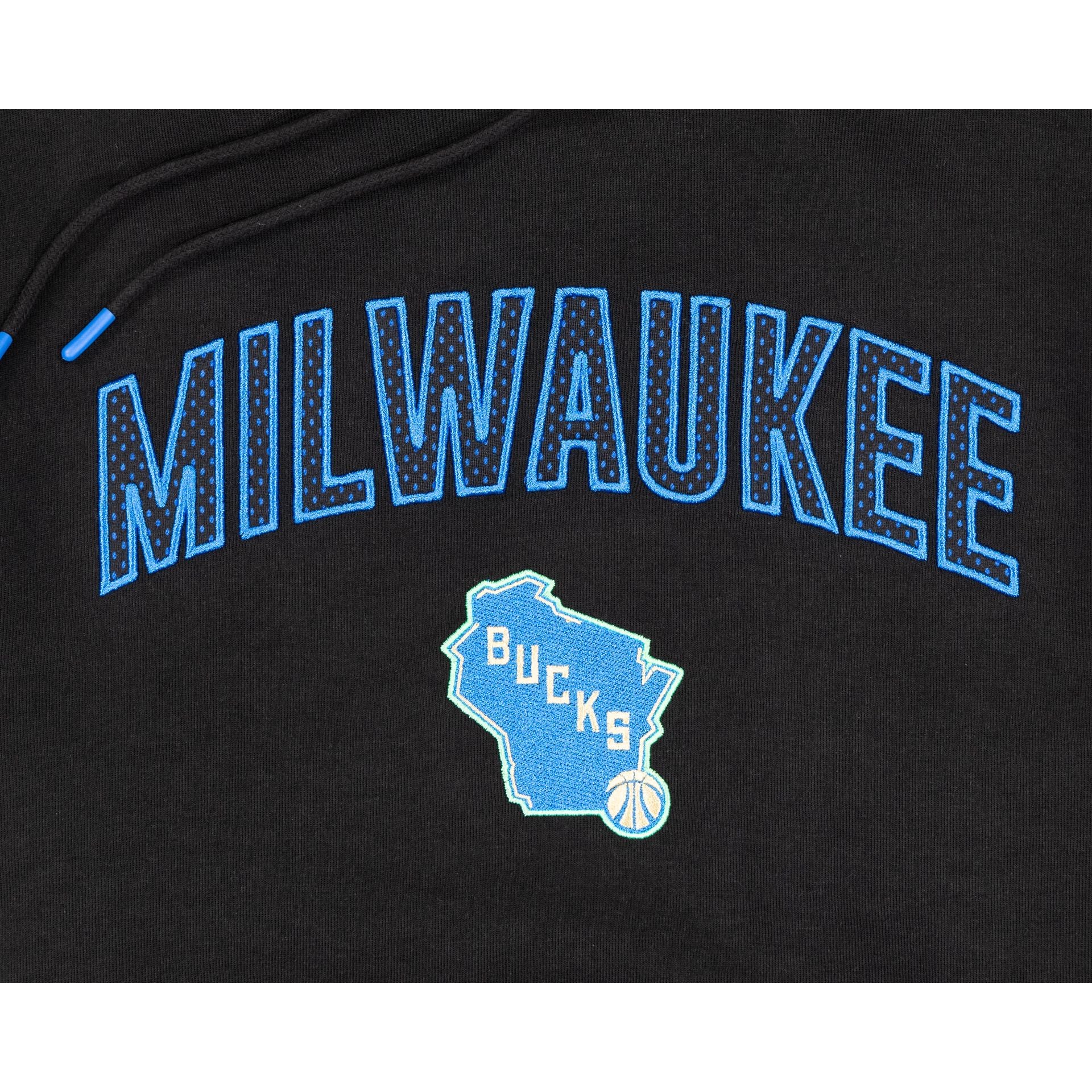 The Milwaukee Bucks 2023 City Edition Black Hoodie features a mesh applique Bucks wordmark and embroidered team logo at the chest with a team jock tag at the kangaroo pocket.