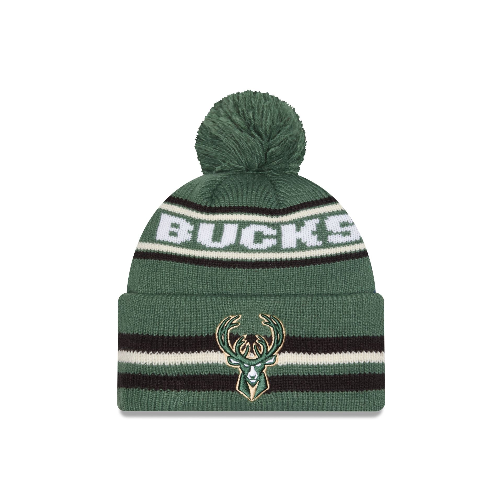 The Milwaukee Bucks Classic Pom Knit Hat features an embroidered Bucks logo at the front cuff with a wordmark at the crown and a one-time removable pom.