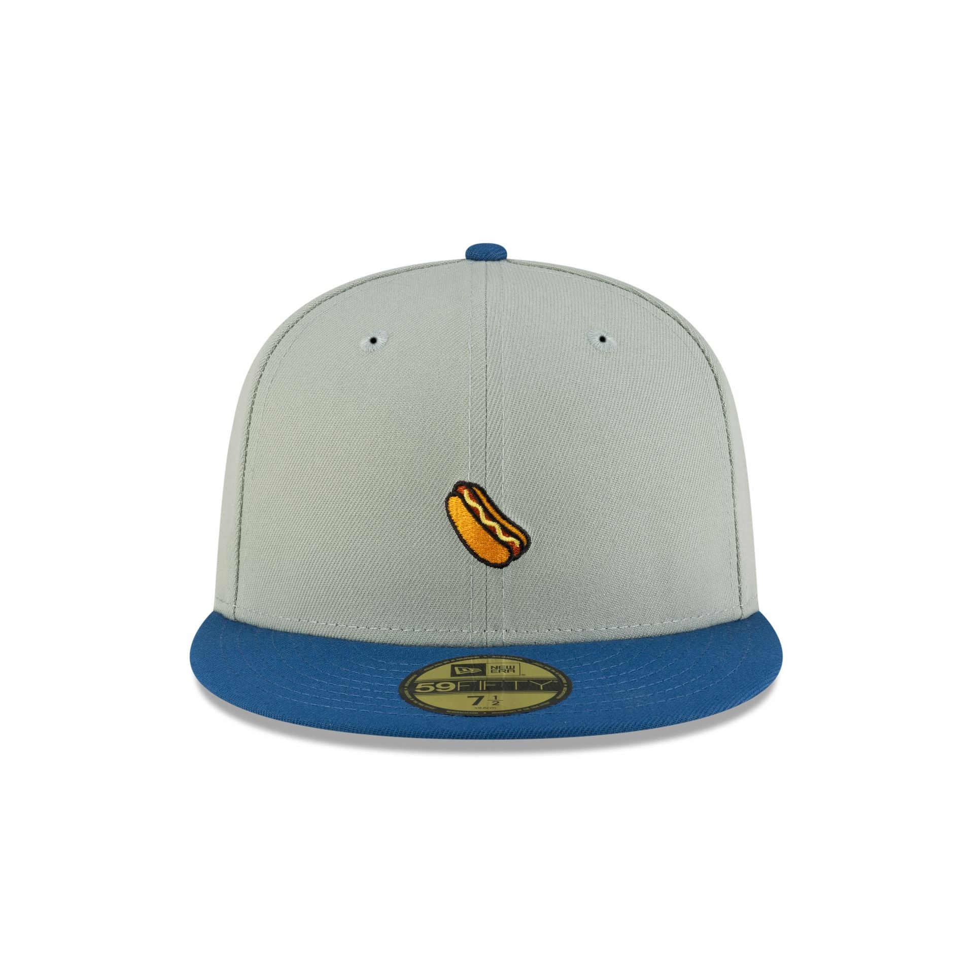 The New Era Cap Hot Dog 59FIFTY Fitted Cap features an embroidered hot dog icon at the front panels with New Era Flag at the left-wear side. a blue visor. and a gray undervisor.