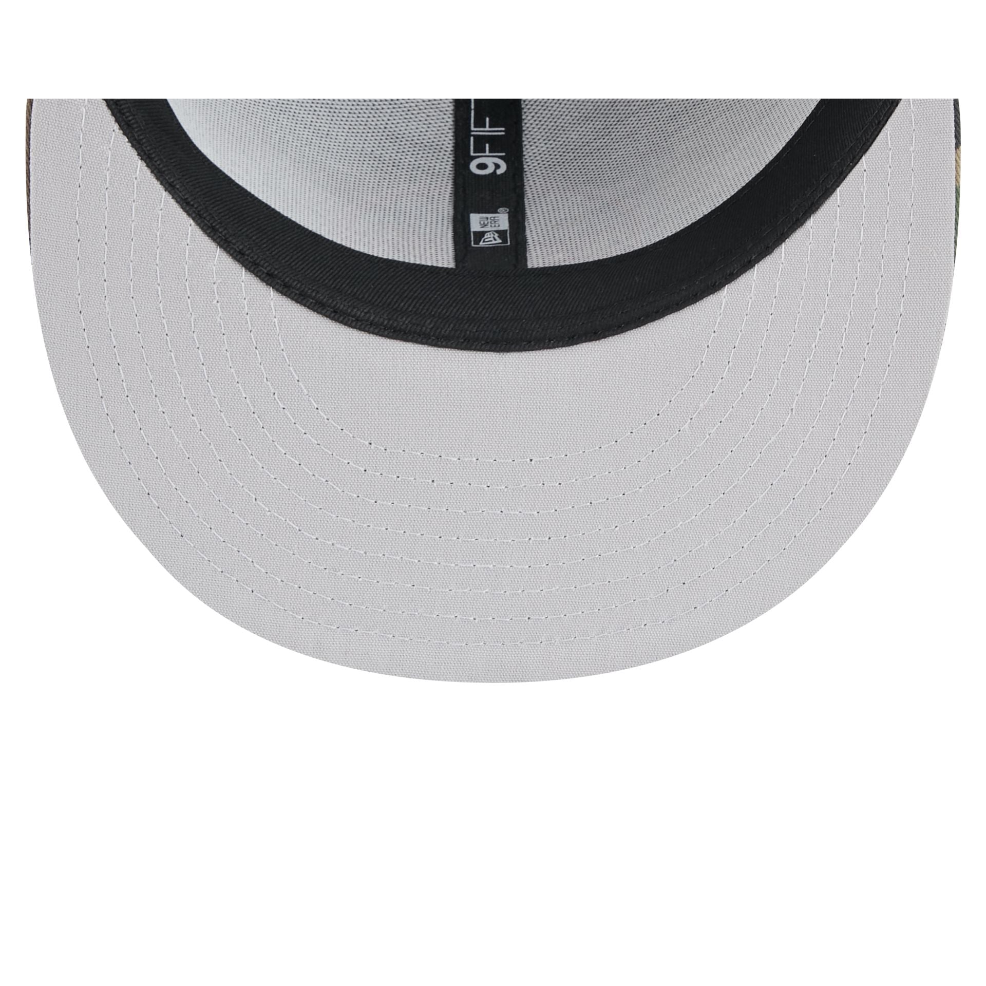 The New York Islanders Camo 9FIFTY Trucker features an embroidered Islanders logo at the front panels with a team tag on a snapback closure at a mesh rear and a gray undervisor.