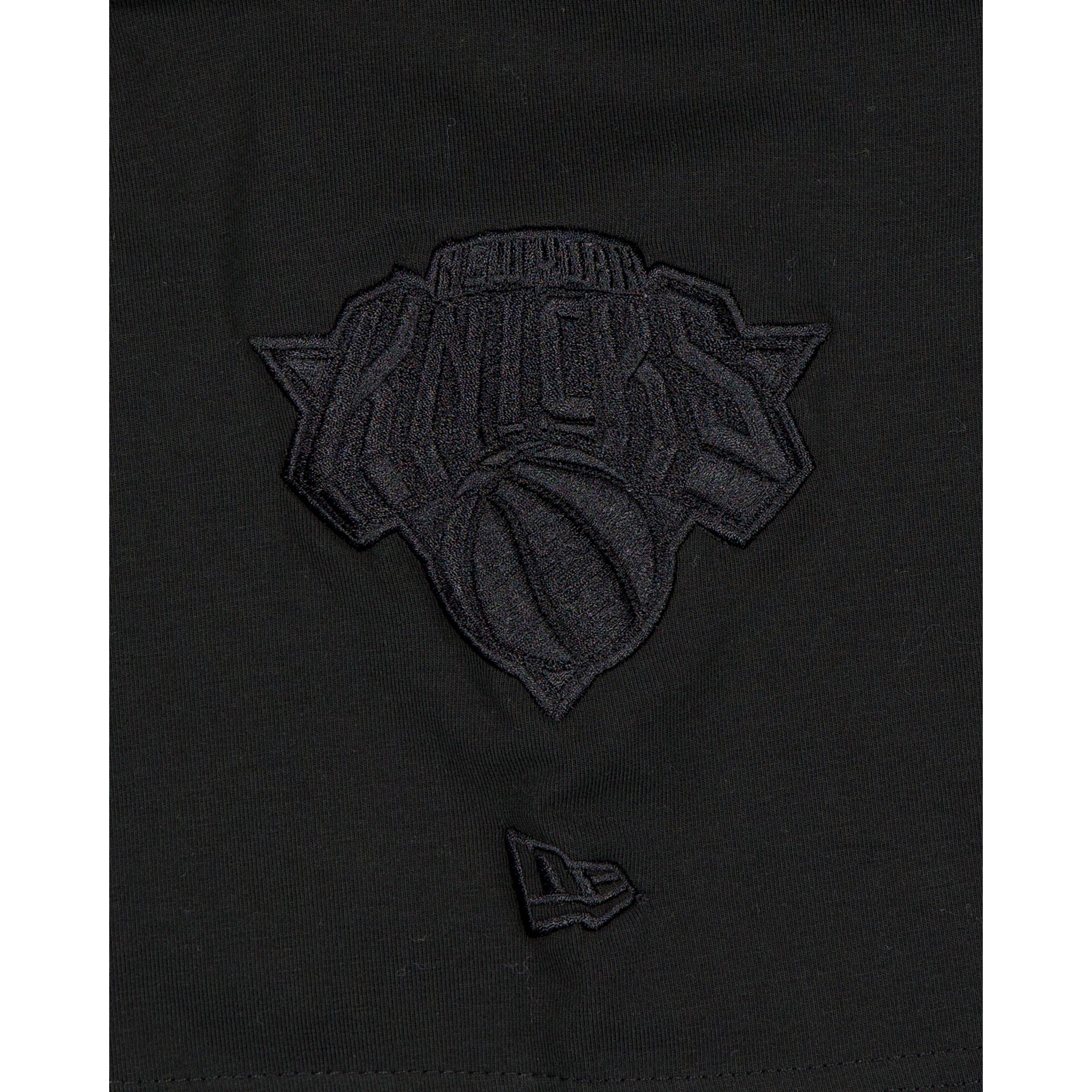 The New York Knicks Black on Black Logo Select T-Shirt features a satin applique with a tonal stitch Knicks wordmark at the chest and an embroidered team logo at the left-wear sleeve.