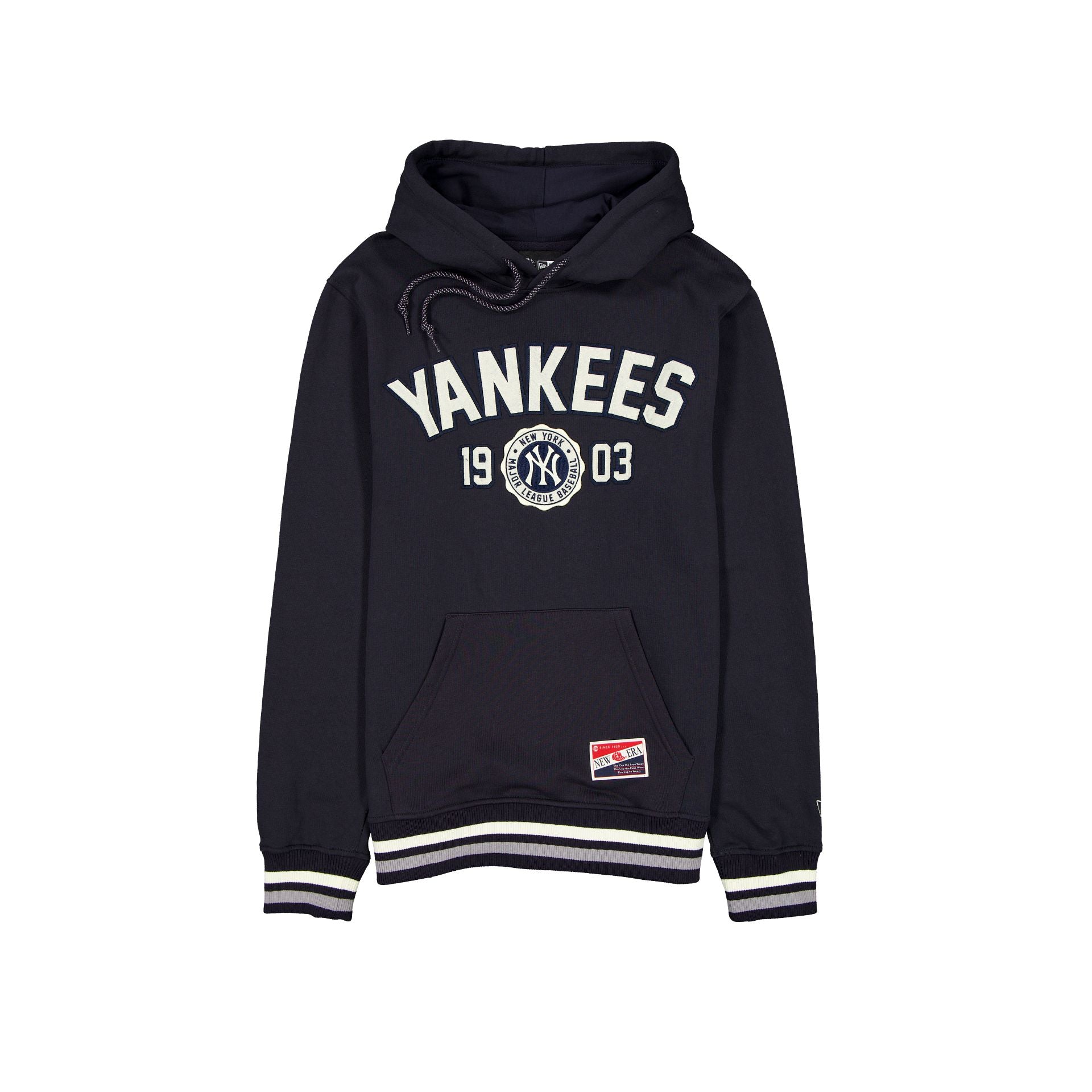 The New York Yankees Throwback Hoodie features a felt applique Yankees wordmark at the front with kangaroo pockets. adjustable drawstrings at the hood. and a New Era jock tag at the left pocket.