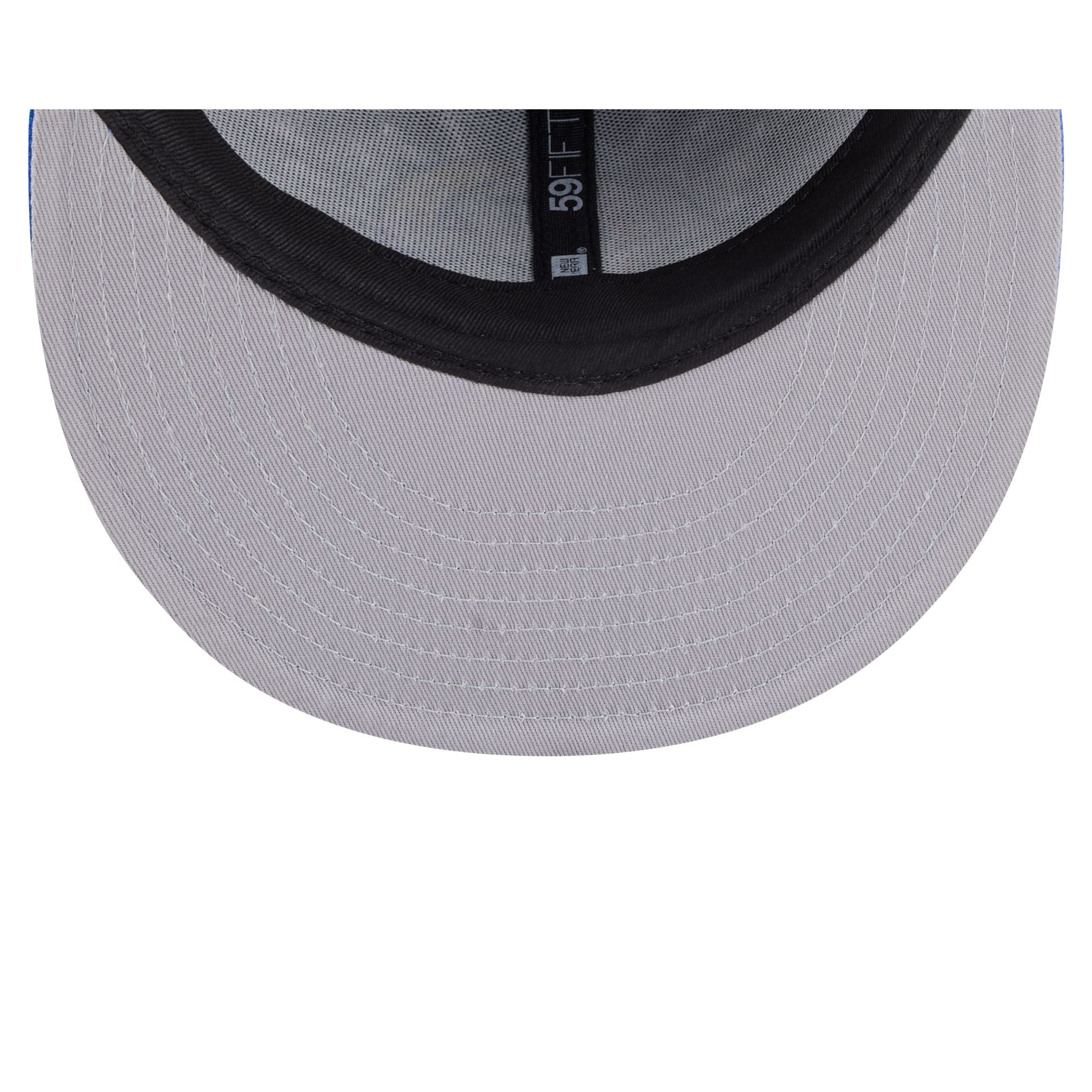 The Nickelodeon Slime x Los Angeles Rams 59FIFTY Fitted Cap features an embroidered Rams slime logo at the front panels with a monochromatic black logo at the rear and a gray undervisor.