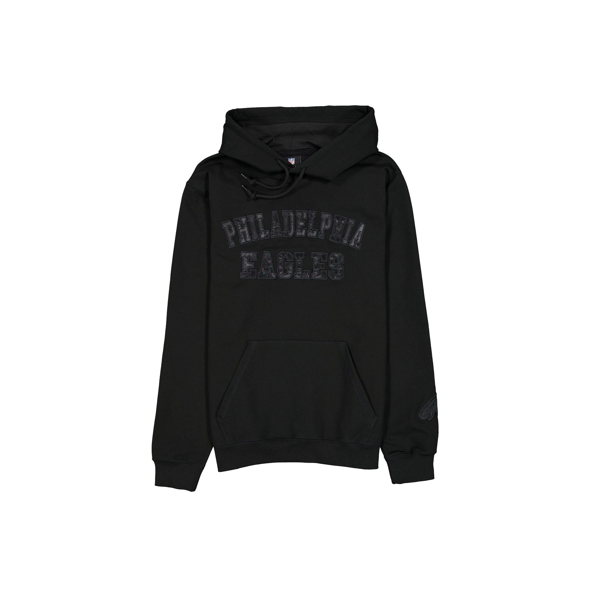 The Philadelphia Eagles Black on Black Logo Select Hoodie features a satin applique with a tonal stitch Eagles wordmark at the chest and an embroidered team logo at the left-wear sleeve.