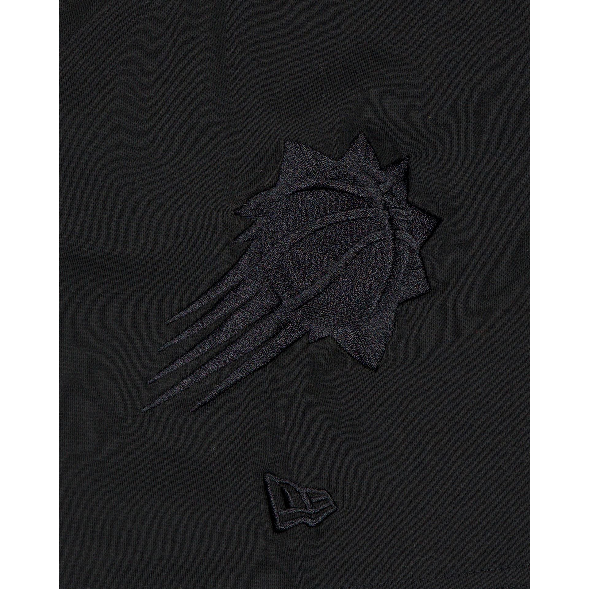The Phoenix Suns Black on Black Logo Select T-Shirt features a satin applique with a tonal stitch Suns wordmark at the chest and an embroidered team logo at the left-wear sleeve.