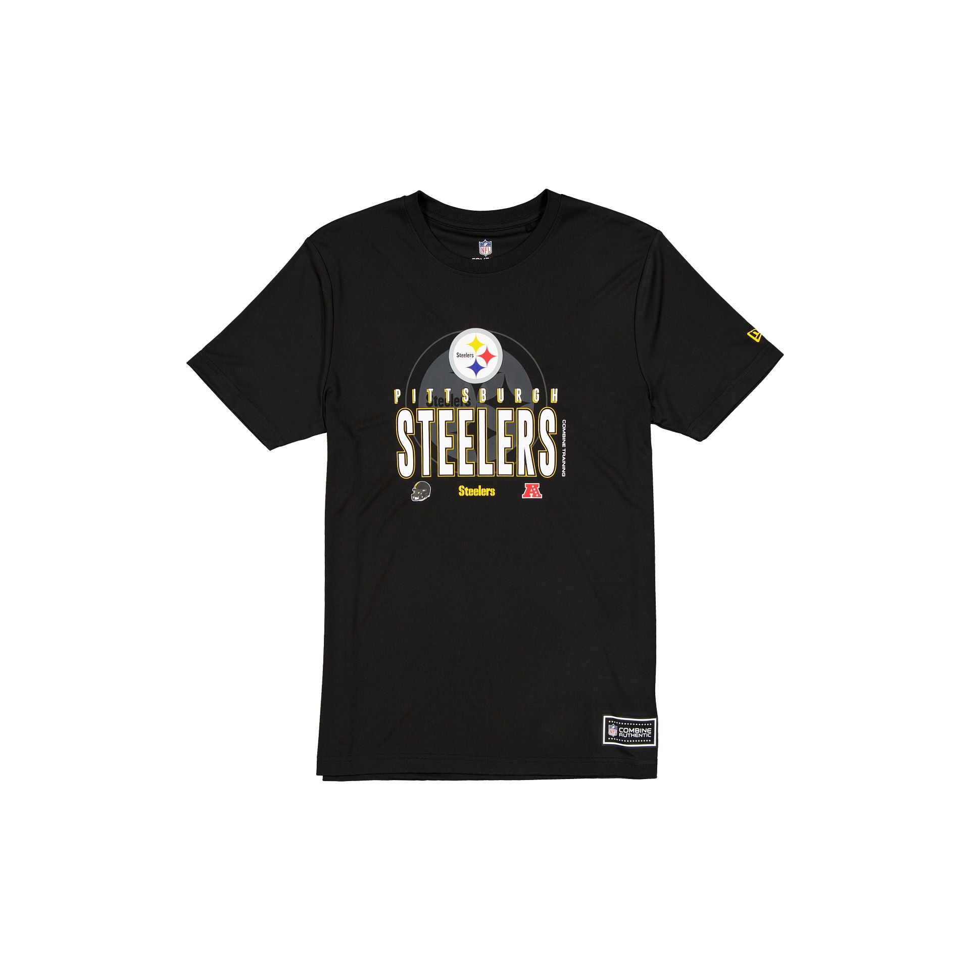 The Pittsburgh Steelers 2025 Training T-Shirt features a screen-printed Steelers graphic at the chest with a heat sealed NFL Combine Authentic jock tag at the hem.