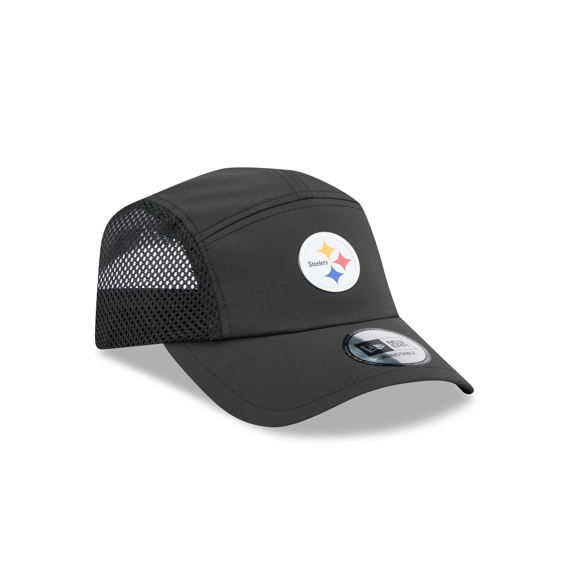 The Pittsburgh Steelers Poly Runner Cap features a heat sealed Steelers logo at the front panels with mesh side panels. Additional details include a silicone patch above an adjustable drawstring closure at the rear.