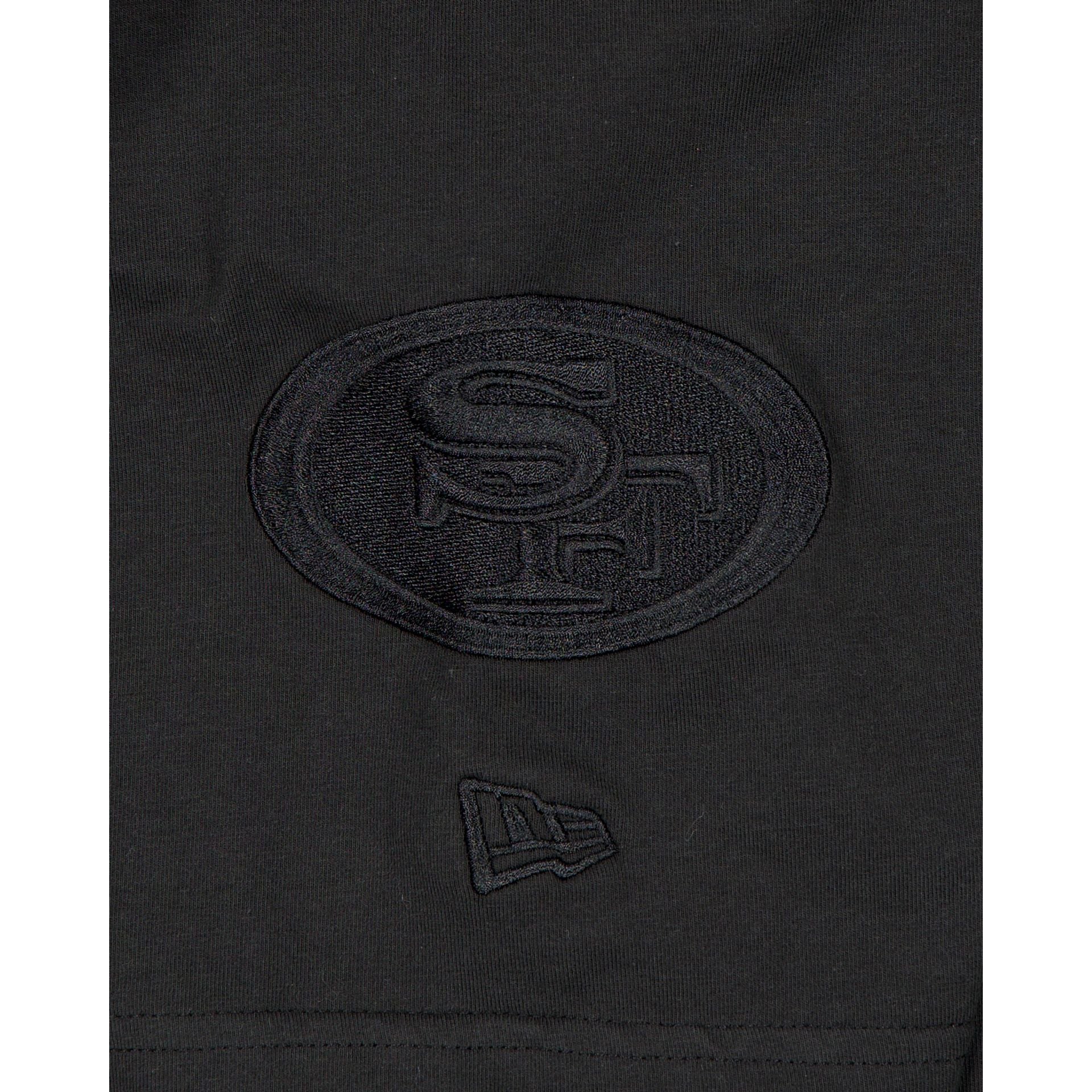 The San Francisco 49ers Black on Black Logo Select T-Shirt features a satin applique with a tonal stitch 49ers wordmark at the chest and an embroidered team logo at the left-wear sleeve.