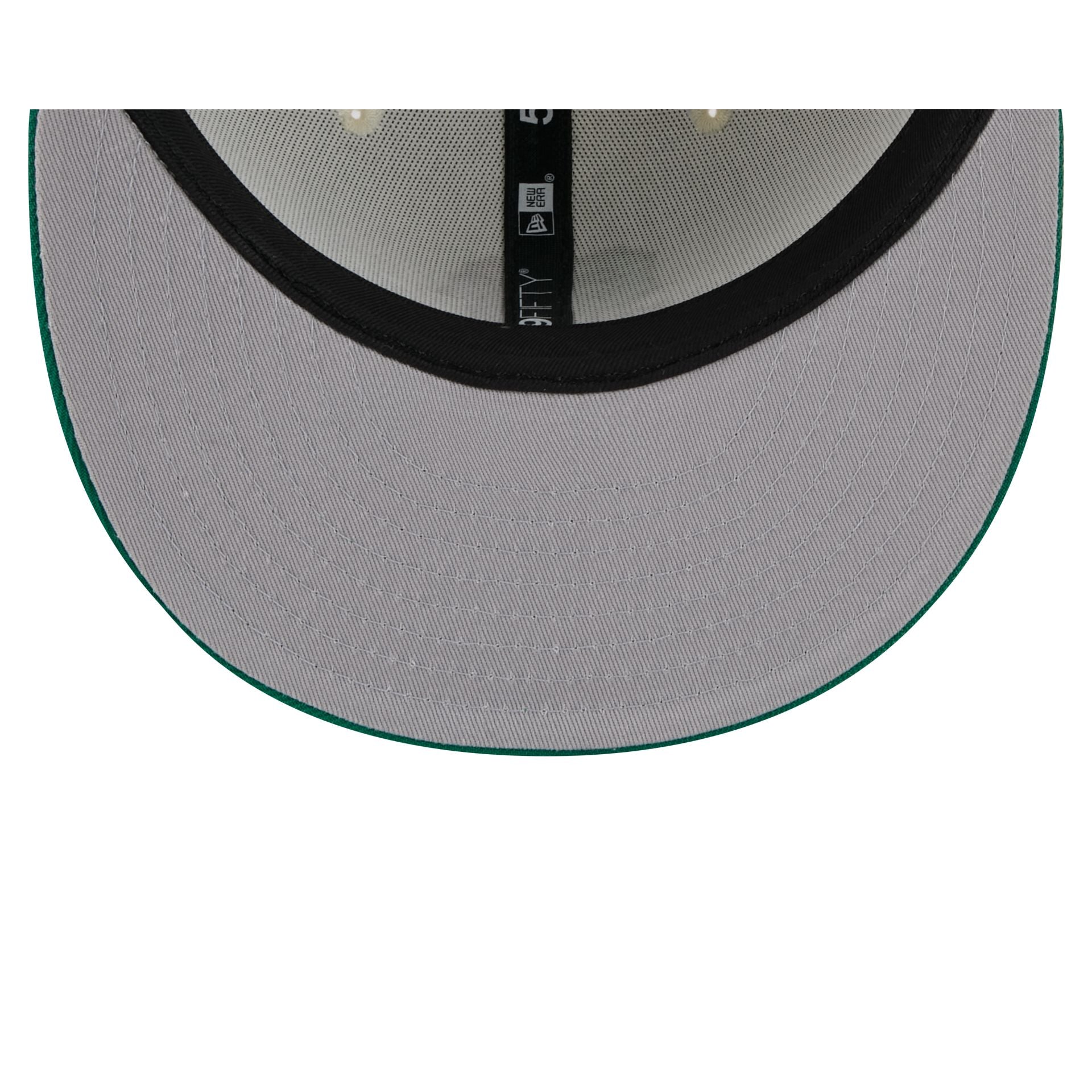 The San Francisco Giants Beaded Linen 59FIFTY Fitted Cap features a red. white and green beaded Giants logo at the front panels with a matching MLB Batterman logo at the rear. Additional details include an embroidered team wordmark at the right-wear side with a green visor and a gray undervisor.