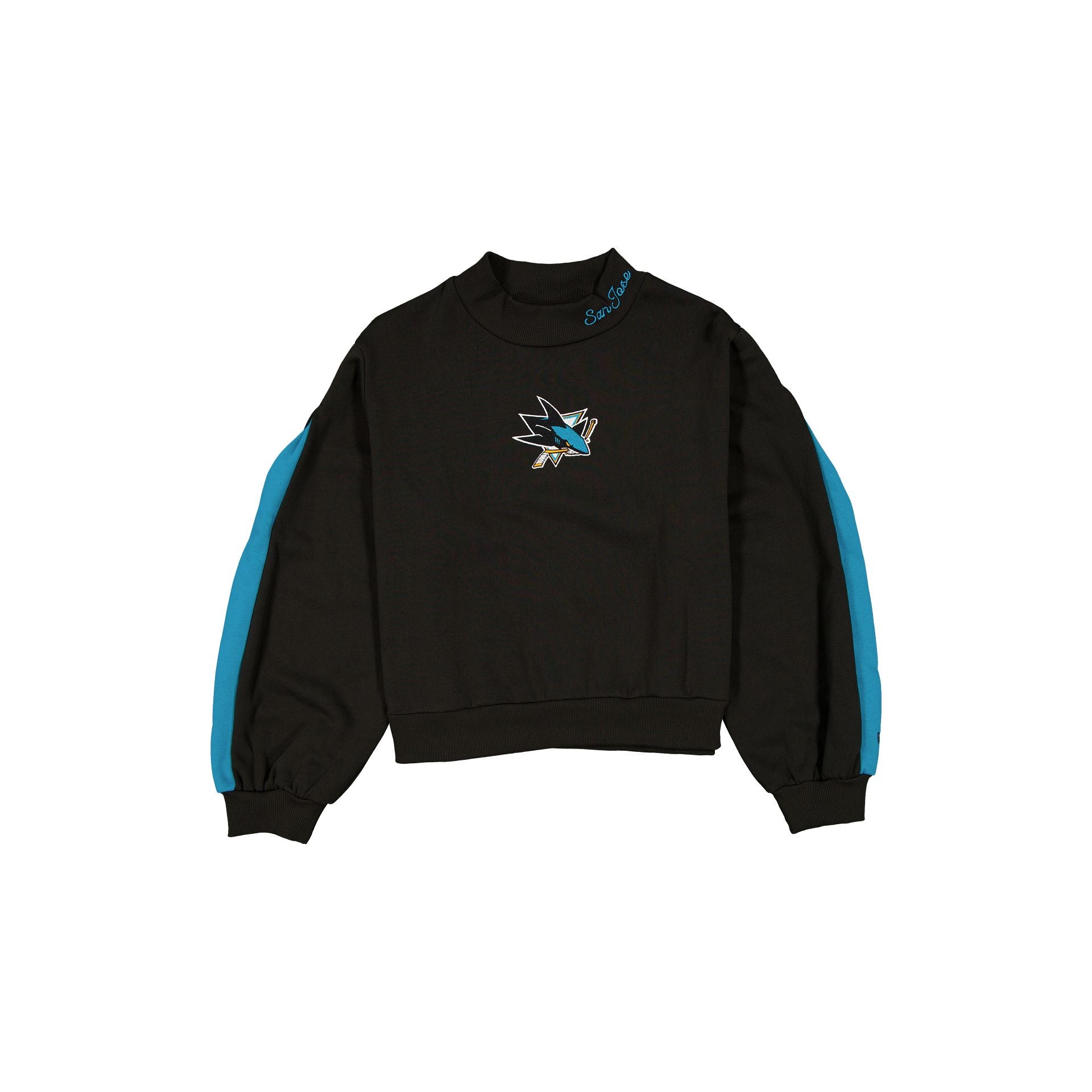 The San Jose Sharks Sport Night Women’s Mockneck features an embroidered Sharks logo at the front chest with a script wordmark at the neck and a wordmark at the rear.