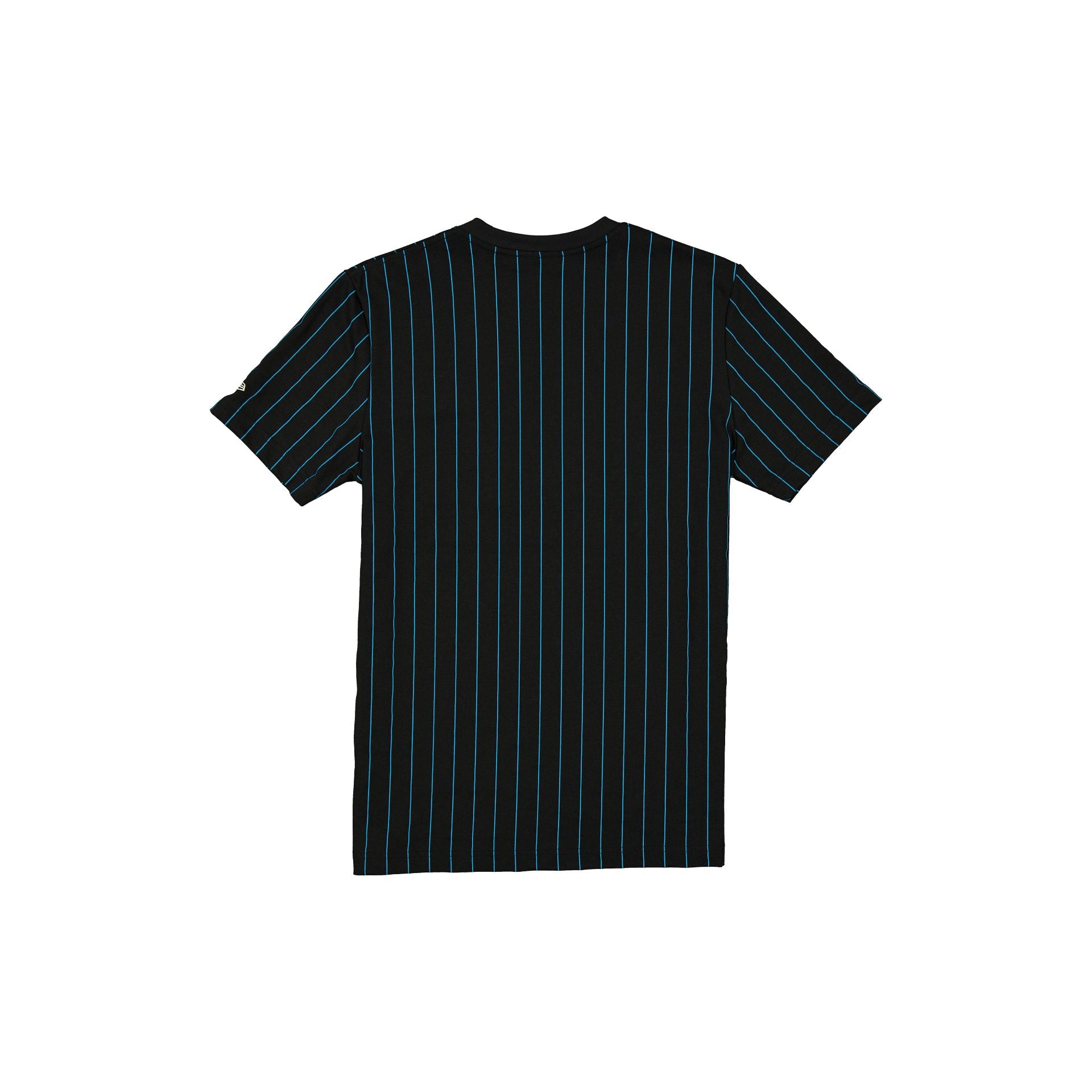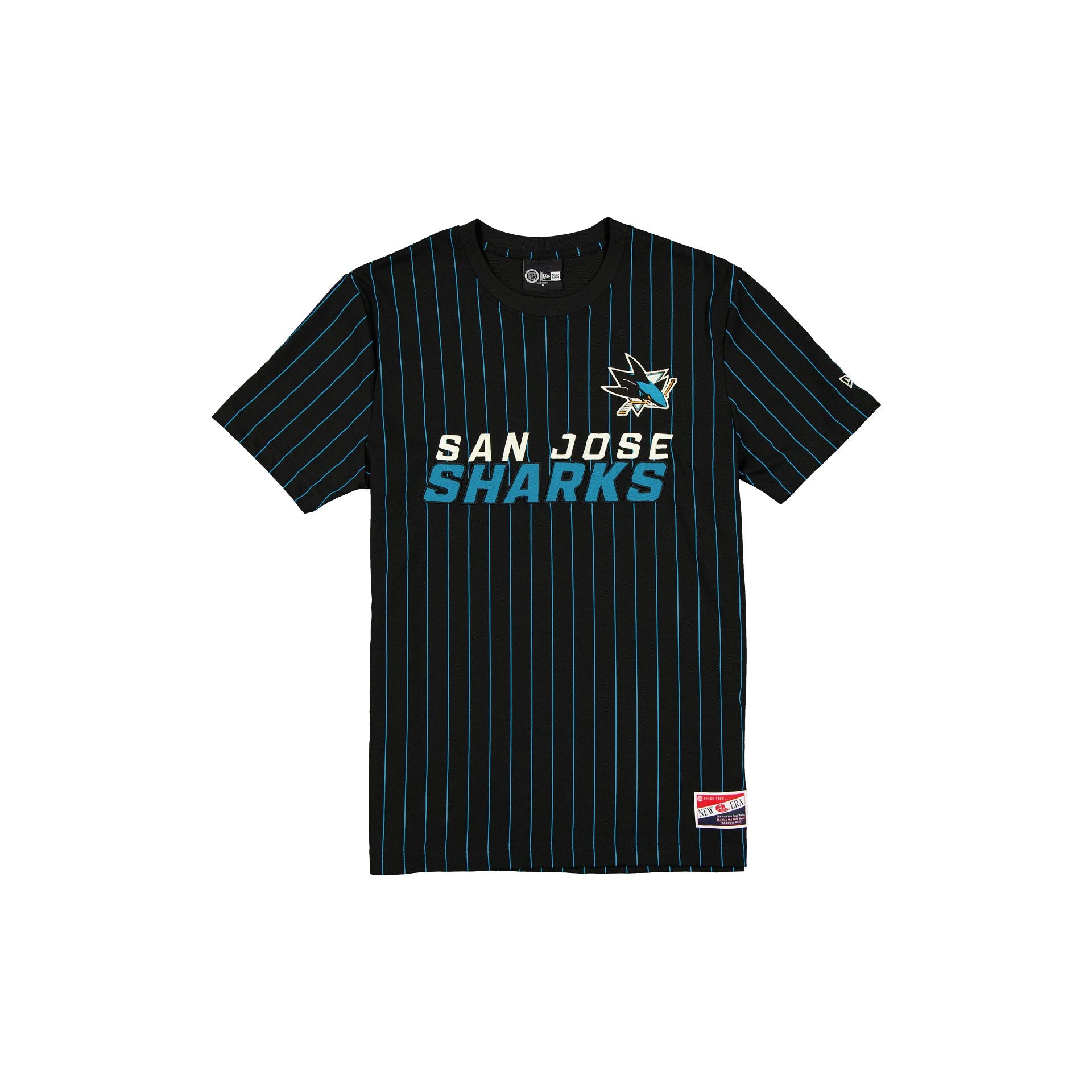 The San Jose Sharks Throwback Retro Pinstripe T-Shirt features an embroidered Sharks wordmark at the front with a twill applique logo at the left chest.