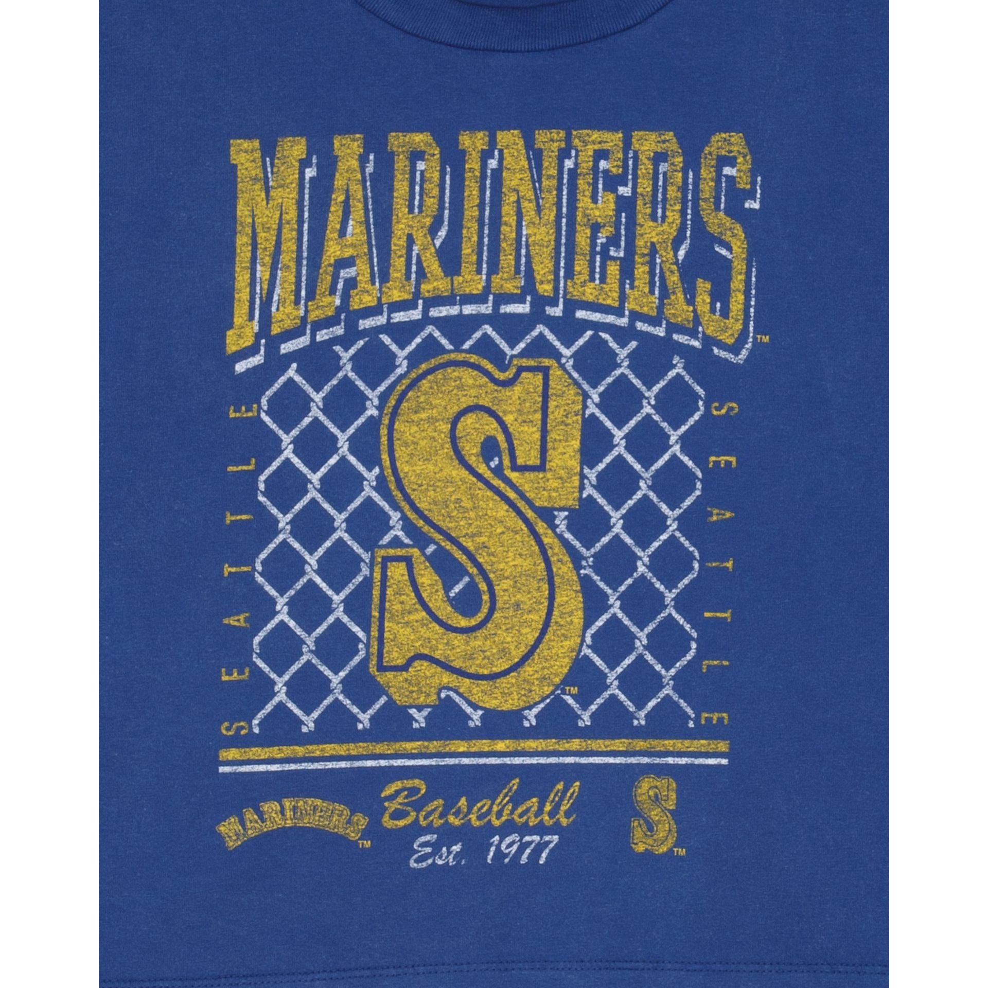 The Seattle Mariners Old School Sport Women’s T-Shirt features a distressed screen-printed Mariners graphic at the front.