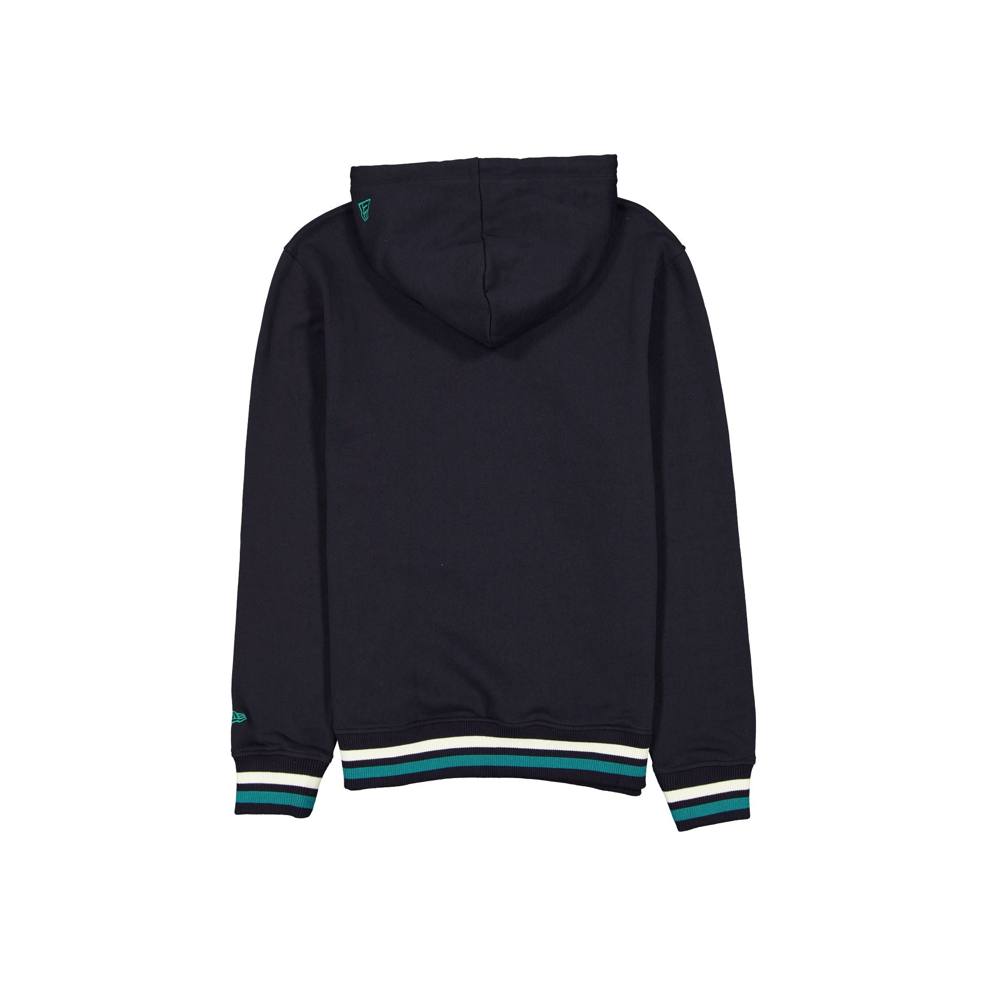 The Seattle Mariners Throwback Hoodie features a felt applique Mariners wordmark at the front with kangaroo pockets. adjustable drawstrings at the hood. and a New Era jock tag at the left pocket.
