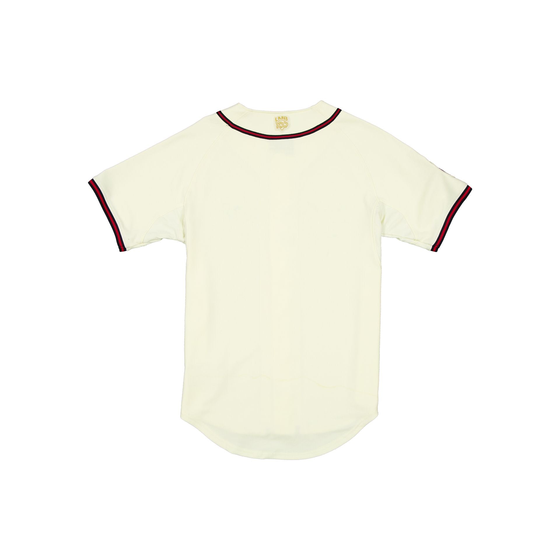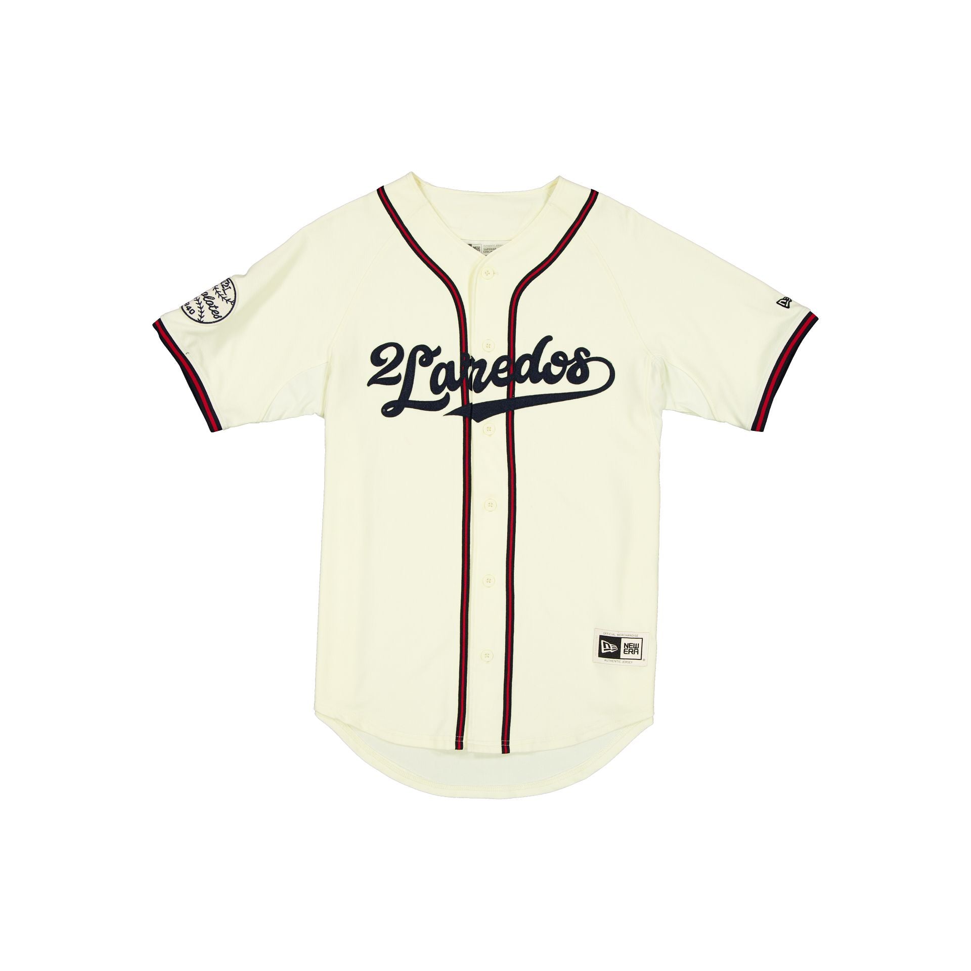 The Tecos 2 Laredos Retro Jersey features an embroidered Dos Laredos applique logo at the chest with a New Era Official Merchandise patch at the front. a team patch at the right-wear sleeve. and a LMB logo at the rear.