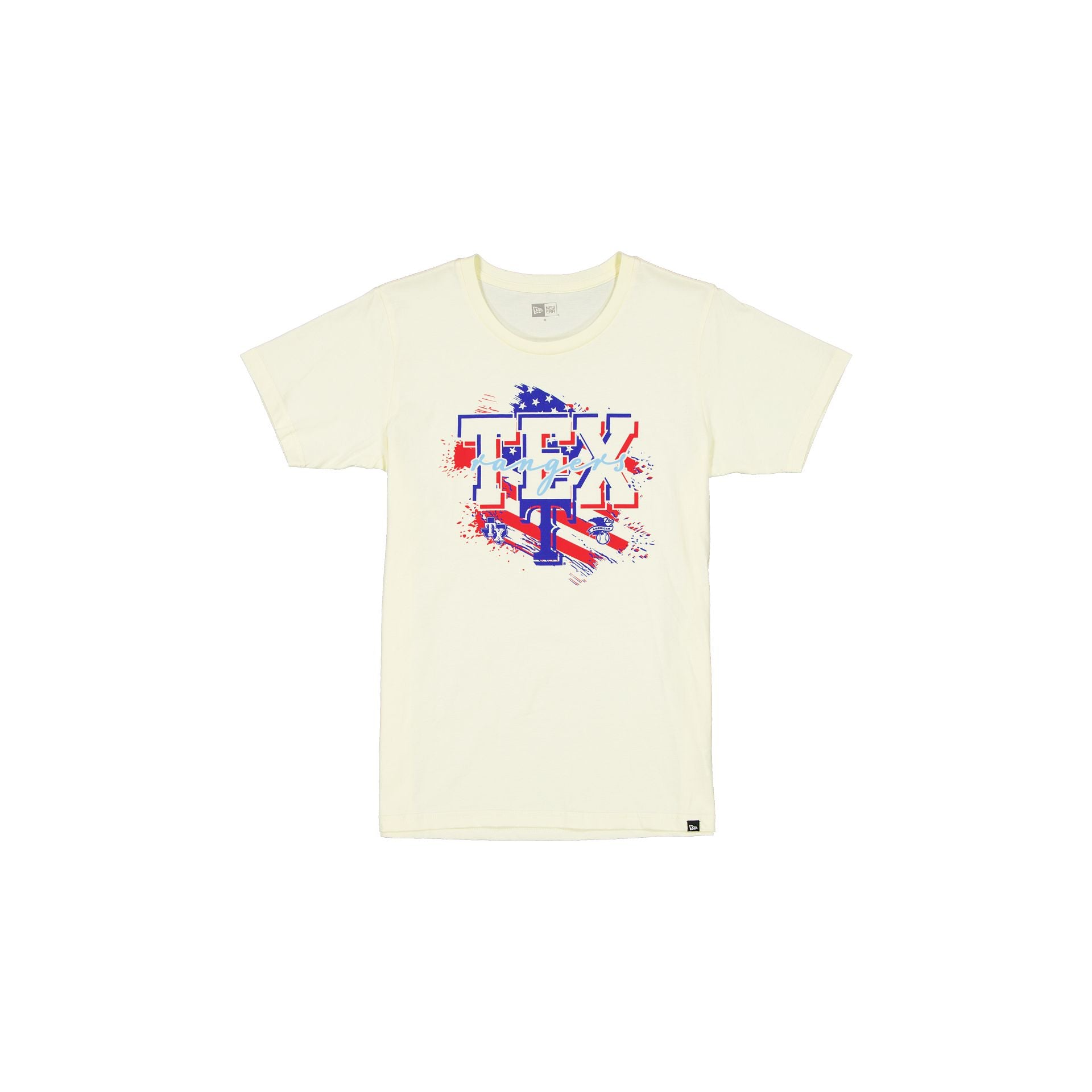 The Texas Rangers Independence Day 2025 Women’s T-Shirt a screen-printed American flag themed Rangers graphic at the front.