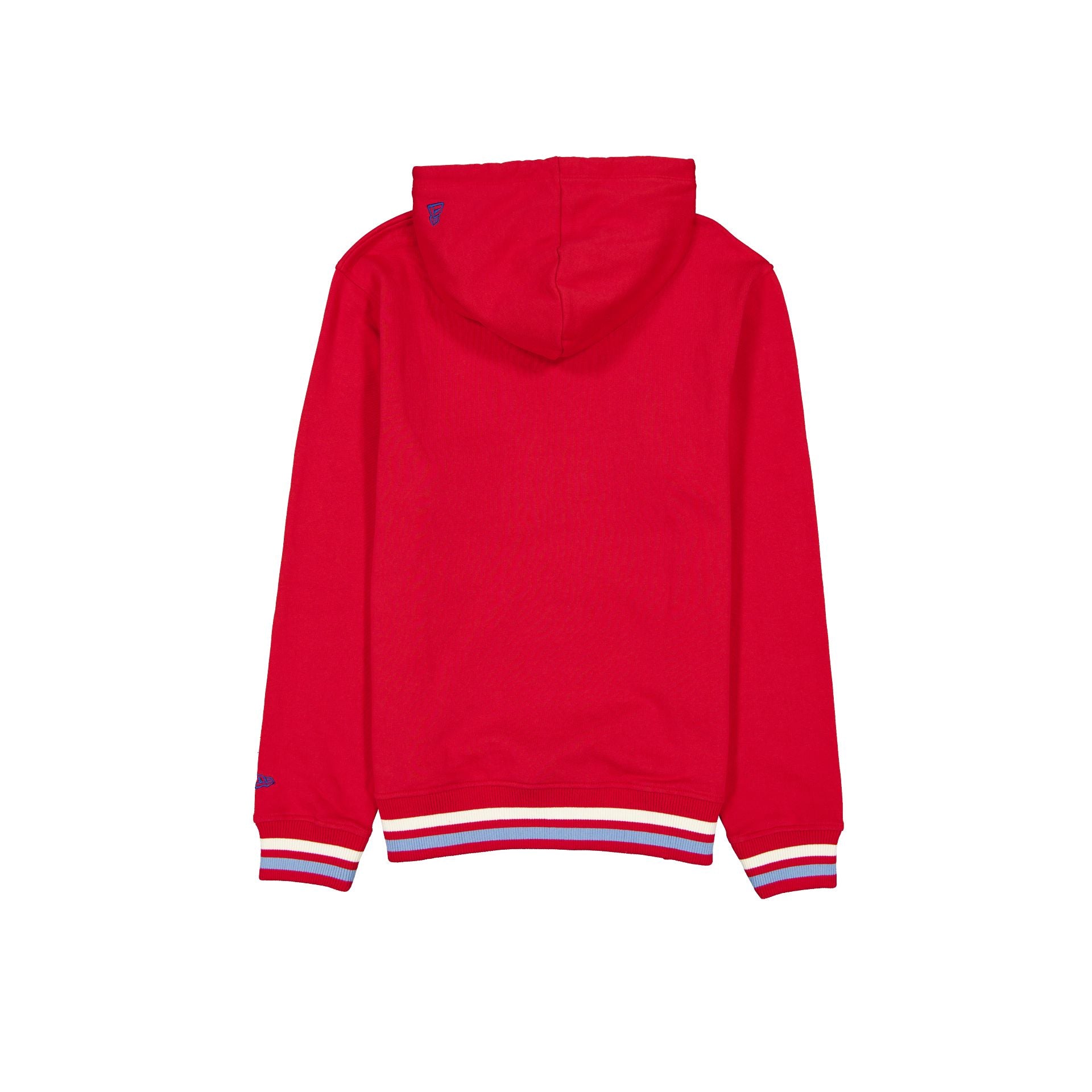 The Texas Rangers Throwback Hoodie features a felt applique Rangers wordmark at the front with kangaroo pockets. adjustable drawstrings at the hood. and a New Era jock tag at the left pocket.